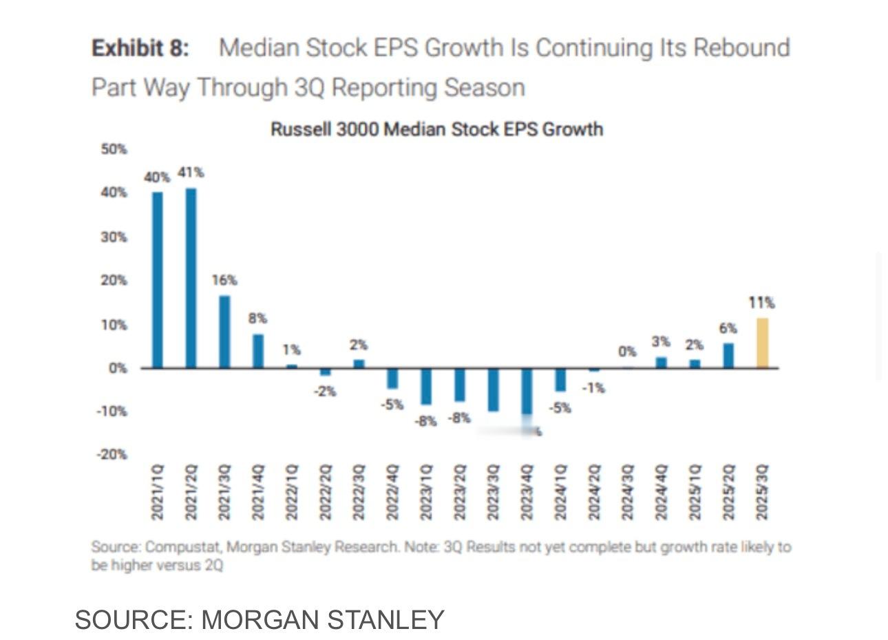 威尔逊和团队在周一发布的报告中指出,截至目前,罗素3000指数中位数股票的第三季度利润增长率为11%,高于第二季度的6%和第一季度的2%。这是自2021年第三季度以来最快的增长速度。
