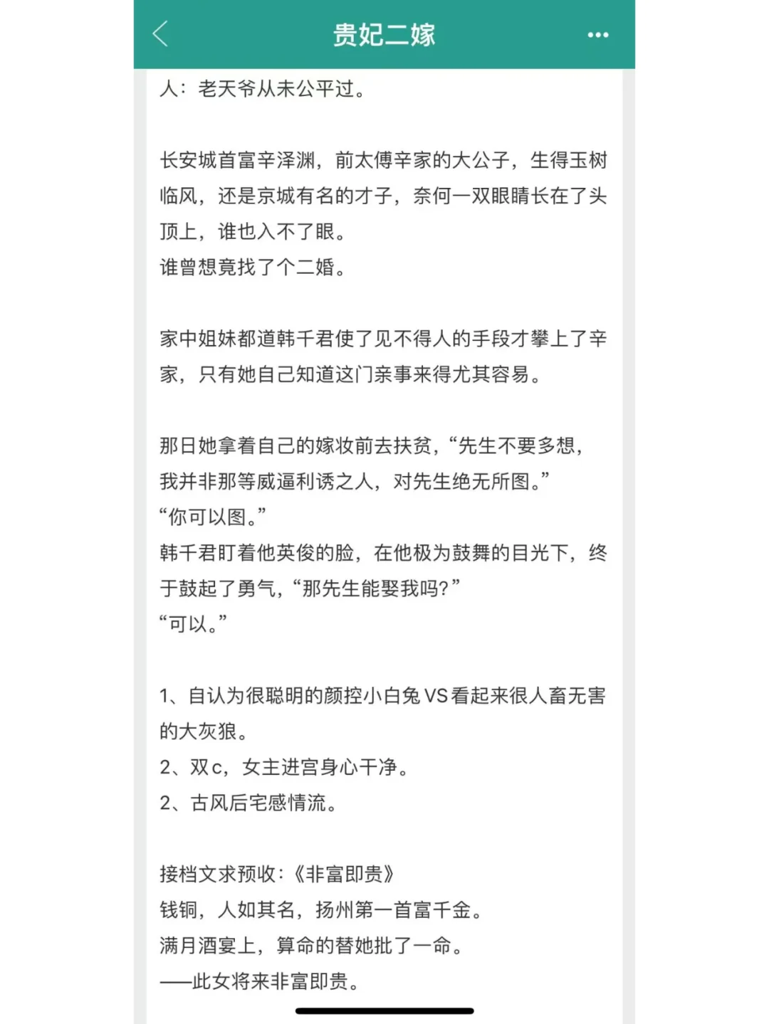《贵妃二嫁》,作者:起跃 主角:韩千君,辛泽渊 *穷先生是我家财万贯的未婚夫 *自认为很聪明的颜控小白兔 x 看起来很人畜无害的大灰狼 *古言/宫廷侯爵/宅斗/日常/古色古香/爽文 *二婚女主找到真爱的故事。起跃大大在写古言上真的很有一手,不管是人物塑造,还是情节新颖程度,又或者是感情线的描写,都有独到之处。起跃大大的文笔细腻,文风古朴,古风意蕴深厚,虽然还未完结,但大家可以先收藏起来看看~ 小说 小说推文 古言 古言权谋 古言小说推荐 宅斗 成长
