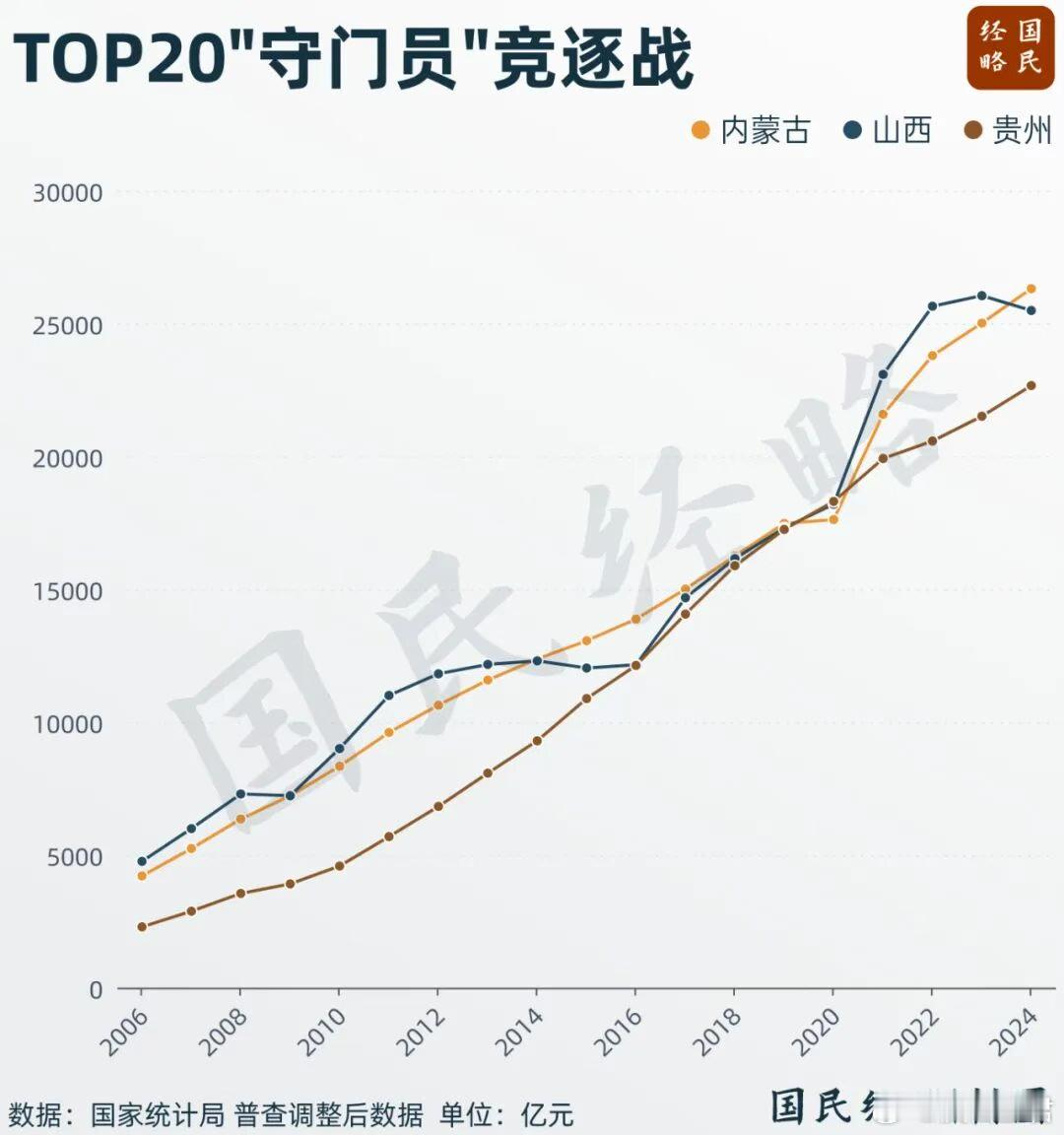 这背后,与东北地区增长降速较慢、传统产业增长放缓、能源大省经济波动不无关系。因此,京津冀之外,北方还需要培育新的增长极,政策层面的扶持不可或缺。山东、河南、河北、陕西势必要挑起大梁,而“东北振兴”任重道远。03TOP20大省,竞逐战仍未结束。过去10年来,贵州、山西、内蒙古轮流成为省域经济TOP20“守门员”。2020年之前,大基建大投资加持,贵州GDP增速连续领跑,一度跻身20强省之列。