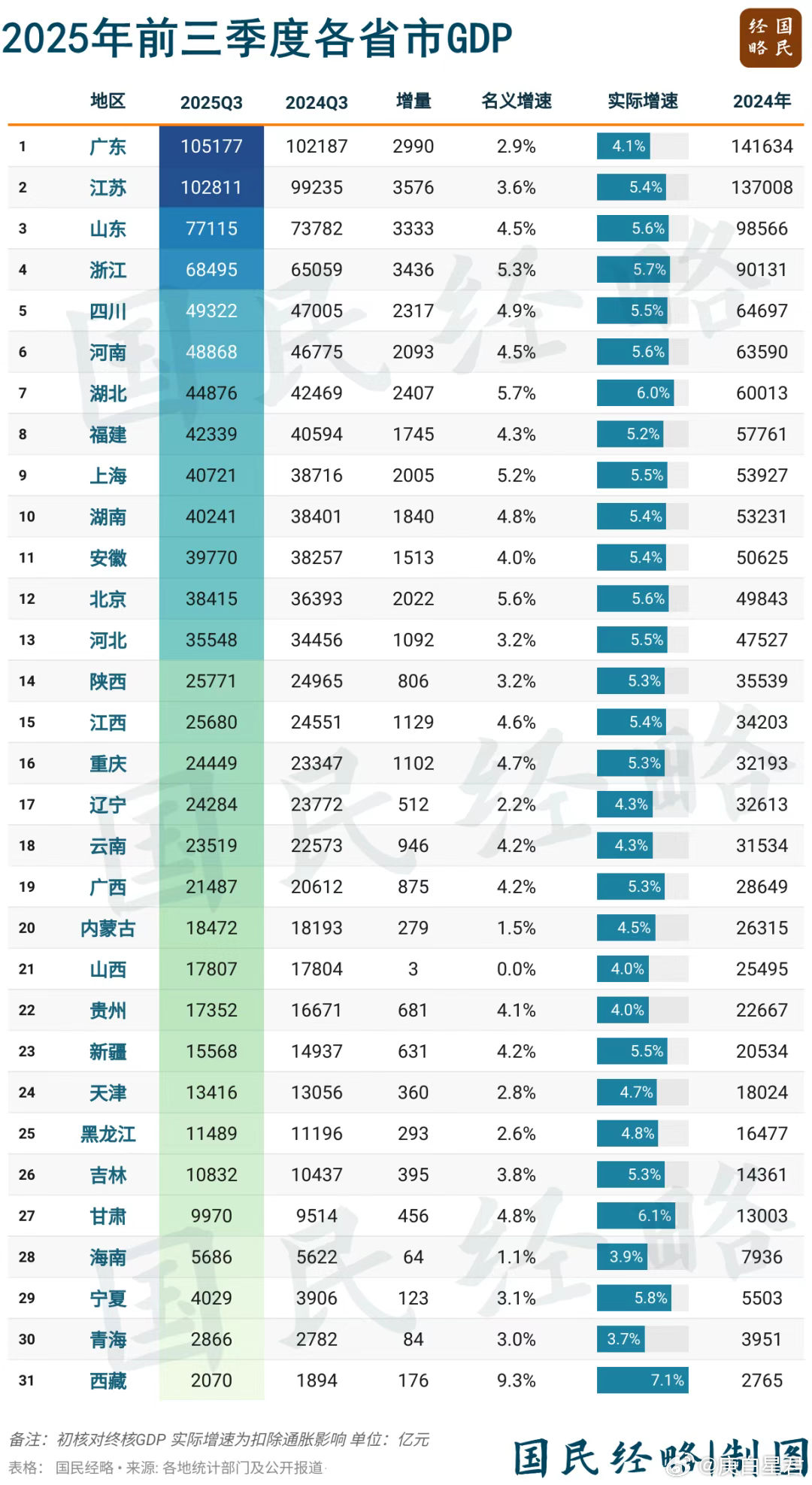 这是2025年前三季度31省份GDP排行:今年以来,外有关税战冲击,内有产业大洗牌,省市经济随之波动。总体来看,除了重庆反超辽宁,省域经济位次基本保持不变,但增速明显分化。西藏以7.1%的实际增速蝉联第一,湖北以6%增速位居经济大省之首,但有10个省份跑输大盘。虽然位次相对稳定,但省域竞逐战更趋激烈。