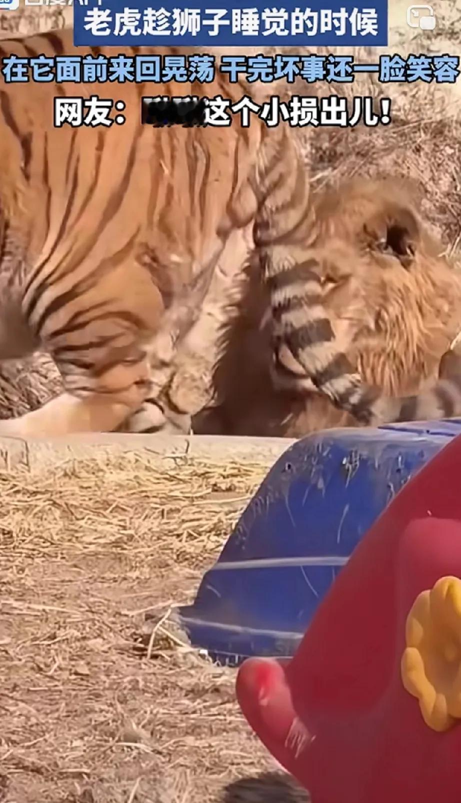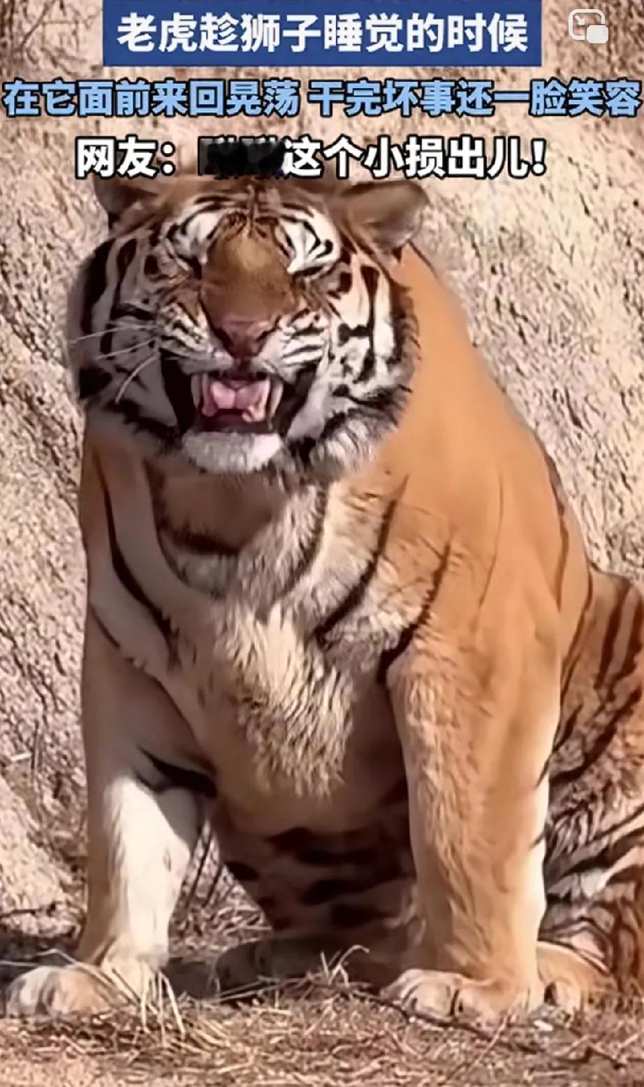 第一次见老虎笑! 动物园里狮子和老虎估计是一块长大的,狮子在睡觉。老虎凑上去了,旁边的饲养员还提醒说“你哥在睡觉,你就别去它眼前晃荡了!” 老虎根本不停,蔫儿坏的把屁股凑到狮子鼻子前边,崩个屁,狮子被熏醒,对着老虎屁股呼了一爪子。 老虎乐的啊,呲着牙笑起来,第一次见老虎还会笑!还怪可爱!
