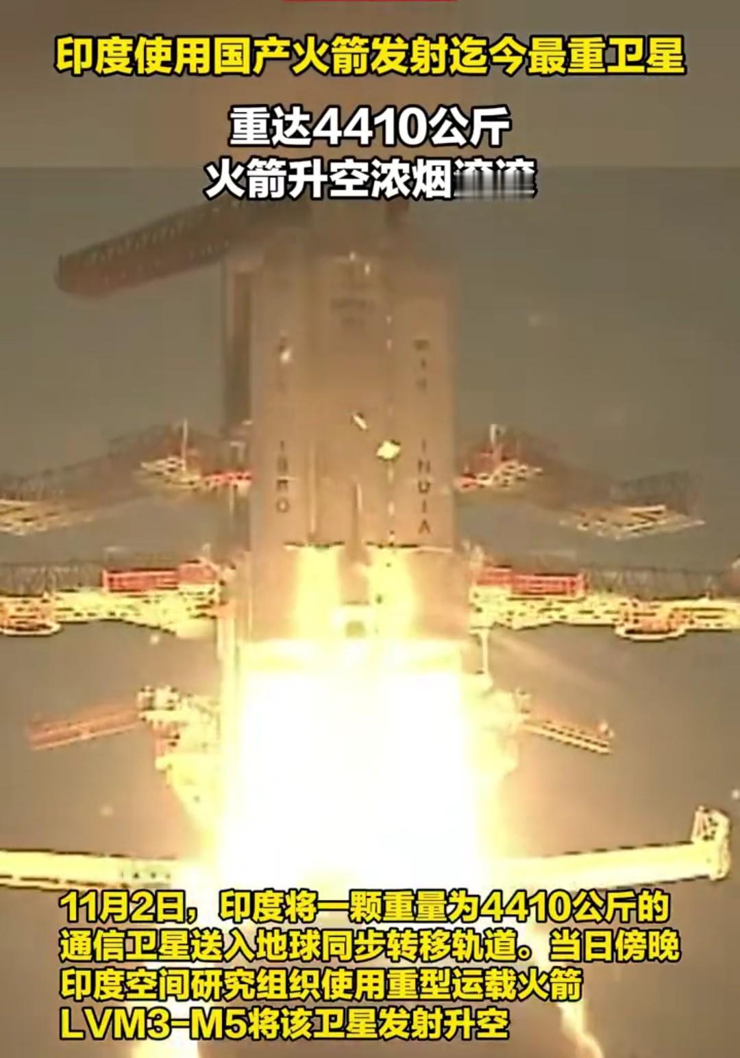 不可置信,印度火箭发射成功了! 近日,印度使用国产火箭发射迄今最重卫星,重达4410公斤,这颗卫星为通信卫星,被送入地球同步转移轨道,据说这是印度使用国产卫星发射的重量最大卫星。 不懂这方面的技术,想知道这次印度火箭发射成功意味着什么?对中国意味着什么? 以前一直觉得这个国家不靠谱,没想到不声不响的,竟然可以成功发射火箭了,是我们低估了这个国家还是因为什么?有人科普一下吗?