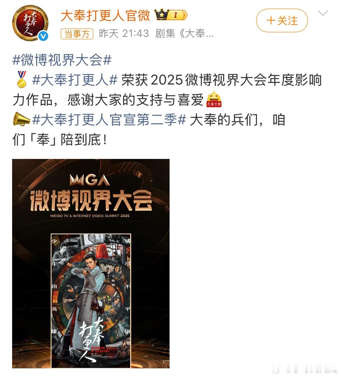 大奉制片人:大奉打更人我们第二季见!🥳(🧣🫘同步官宣)制片人获奖词:“感谢
