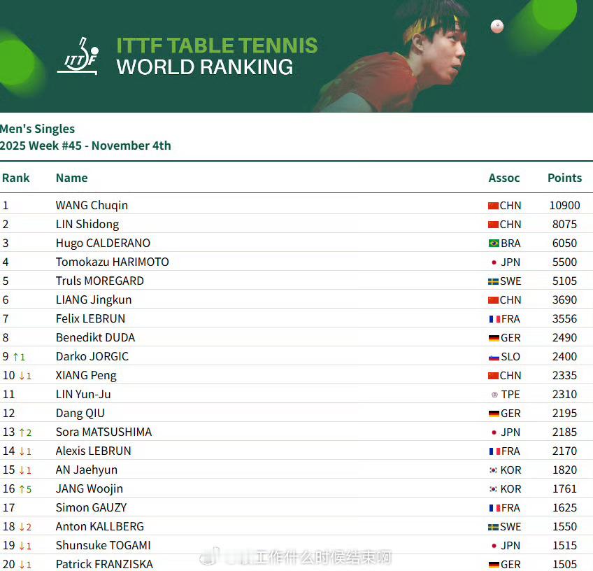 📢大迪上升一位来到第四2025国际乒联第45周排名