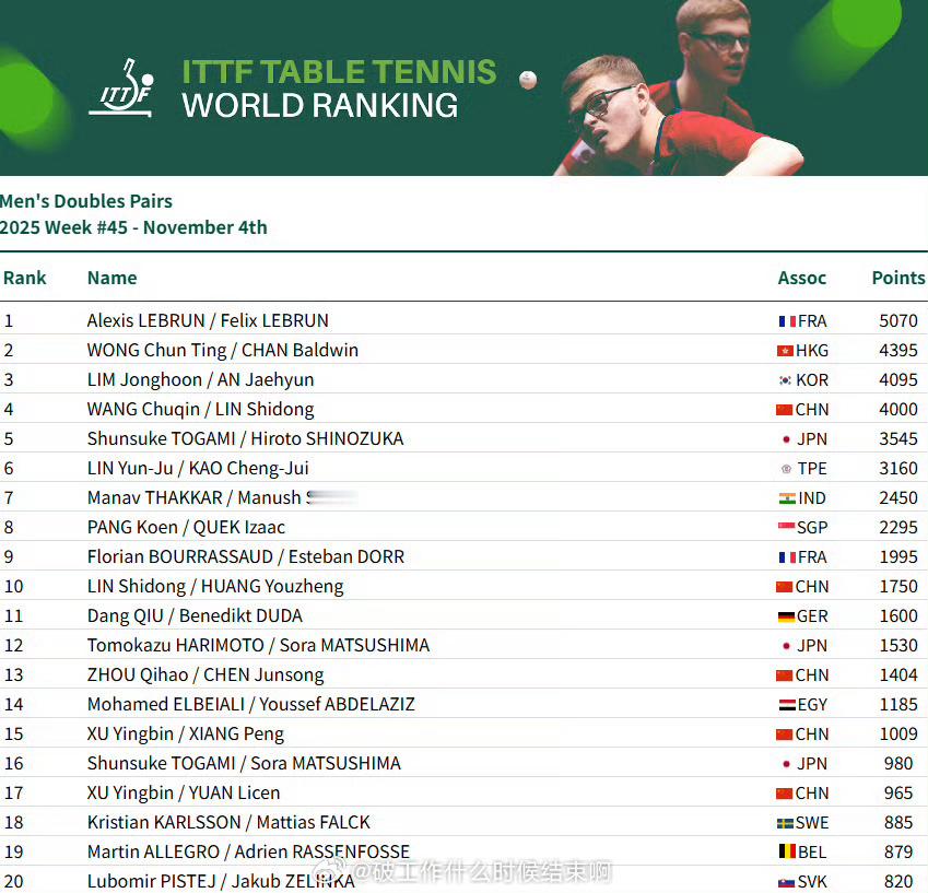 🏓男双:王楚钦/林诗栋第4、林诗栋/黄友政第10