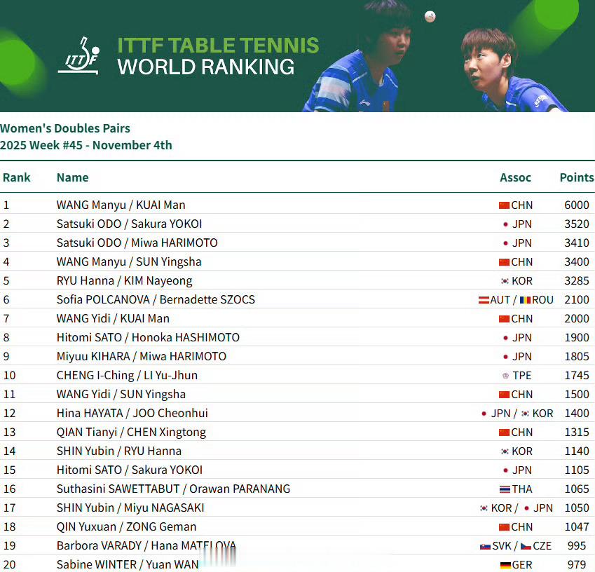 🏓女双:王曼昱/蒯曼第1、孙颖莎/王曼昱第四、蒯曼/王艺迪第7、孙颖莎/王艺迪第11
