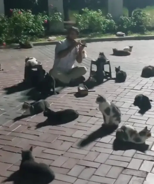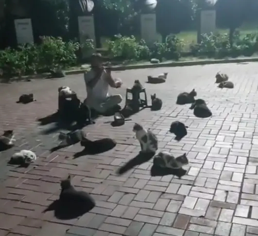 有网友拍到有趣的一幕:一男子深夜吹笛子,身边围了一群猫。