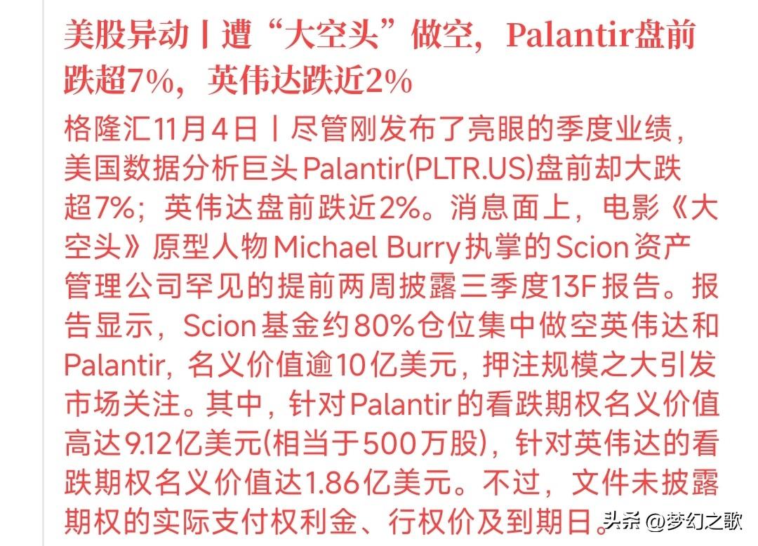 今天美股被大空头搞事情,大跌在所难免 今天的美股要上演电影的桥段了,Scion基金约80%仓位集中做空英伟达和Palantir,名义价值逾10亿美元,这可是电影的桥段,今天英伟达的看跌期权高达1.86亿美元。 虽然对于5万亿市值的英伟达来说,10亿美元不算什么,但是就怕引起市场的恐慌情绪。 盘前英伟达跌2%,特斯拉跌2.69%,苹果跌0.90%,大型科技股出现了普跌的情况。 这种突然的“黑天鹅”事件对于美股来说还是挺棘手的,至少今天的大跌是跑不了了,明天会不会连续大跌就看今天晚上能不能拉回一些了。
