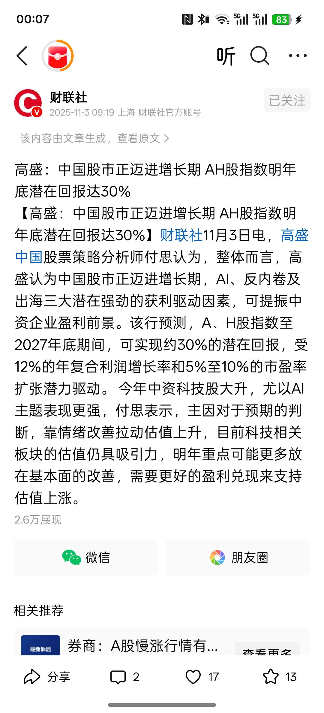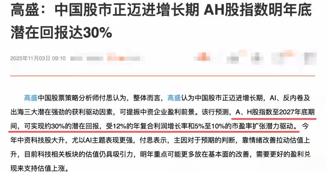 明年A股要涨到5000点,高盛:中国股市正迈进增长期AH股指数明年底潜在回报达
