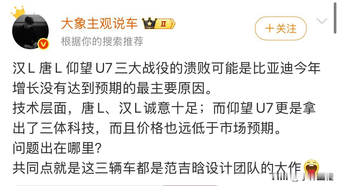看吧,不是我一个人说比亚迪的利润下滑,跟中高端销量“崩盘”有关吧! 其实关于迪子利润的问题,稍微正常点的人都能看得出来,低端销量高了,中高端销量占比太低,肯定会影响利润,并且今年车型基本都是加量不加价,低端本来就没什么利润可言,中高端还那么差,能不拉低利润点嘛?