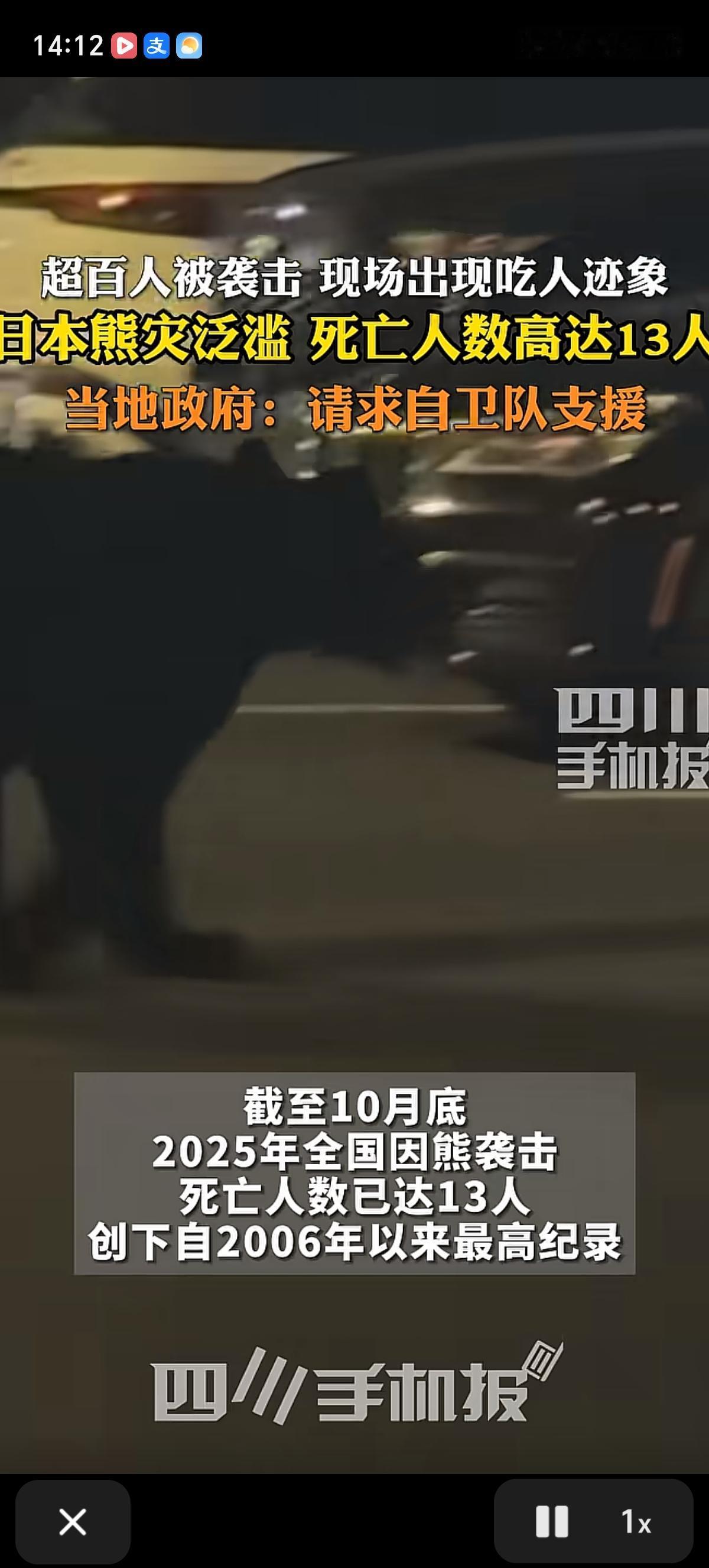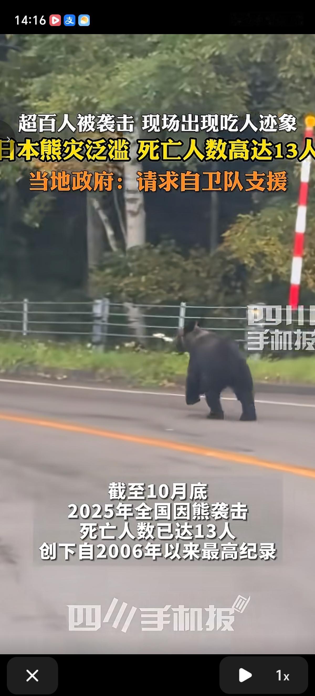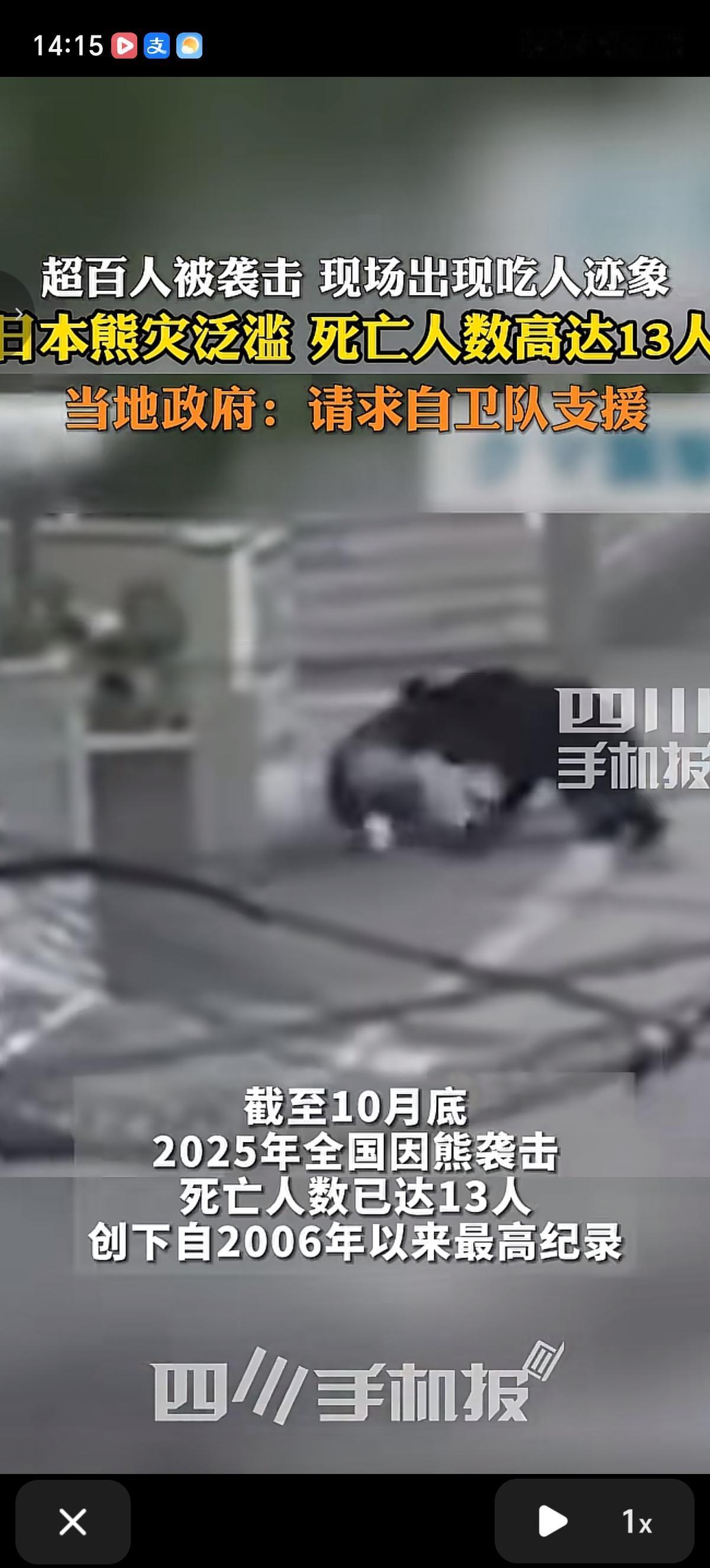 近期,日本多地持续遭遇严重熊灾,已造成13人死亡、超百人被袭击受伤,部分袭击现场出现熊类啃食人体的恐怖迹象,引发社会恐慌。 此次熊灾波及日本北海道、青森、秋田等多个地区,熊类频繁闯入居民区、农田甚至学校。北海道一名70岁老农在田间劳作时,被一头成年棕熊袭击,身体多处被咬伤,送医后因伤势过重死亡;青森县某居民区发生熊闯入民宅事件,户主夫妇被咬伤,现场发现熊类啃食痕迹。此外,秋田县一名小学生上学途中遭遇熊袭击,幸得路人及时驱赶才未酿成悲剧。 据日本环境省统计,今年以来,日本已发生熊类伤人事件超120起,死亡人数较去年同期激增3倍。熊灾泛滥的主要原因包括:山林食物短缺导致熊类下山觅食,人类活动范围扩大侵占熊类栖息地,以及部分地区对熊类的保护过度导致其野性增强。 目前,日本多地已启动紧急应对措施,组织专业人员捕杀肇事熊,在居民区周边设置防护栏和警示标识,并对民众开展防熊安全教育。但由于熊类活动范围广、机动性强,防控工作面临较大挑战,当地民众呼吁政府出台更有效的长效治理方案。