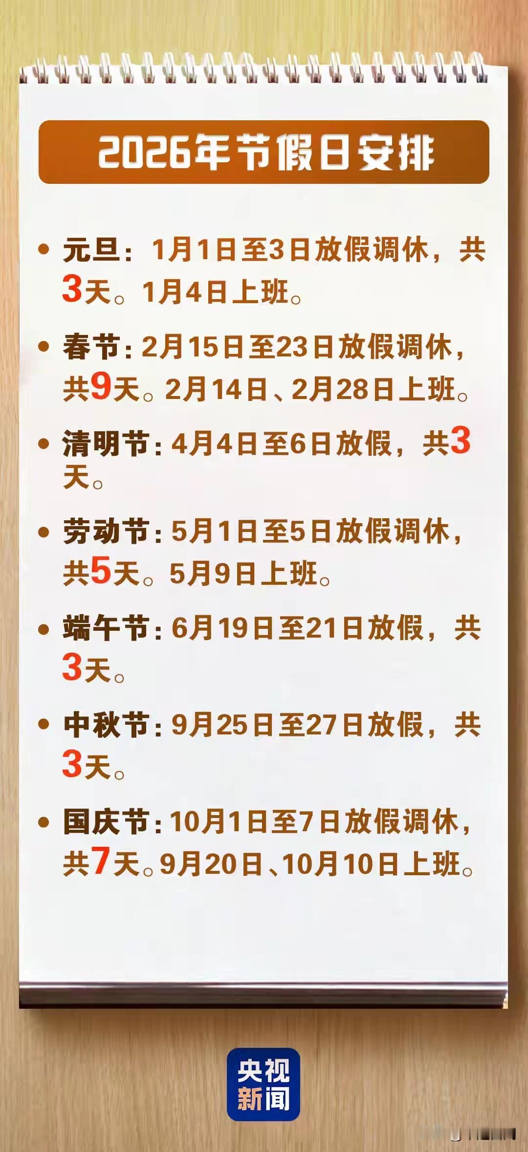 幸福时刻!春节假期共9天 2026年放假安排来了! 国务院办公厅关于2026年部分节假日安排的通知! 南方的小土豆们又要去哈尔滨的冰雪大世界了。 放假了希望今年能下点雪,已经好几年是大晴天了,没有了年味确实让人感触不深!