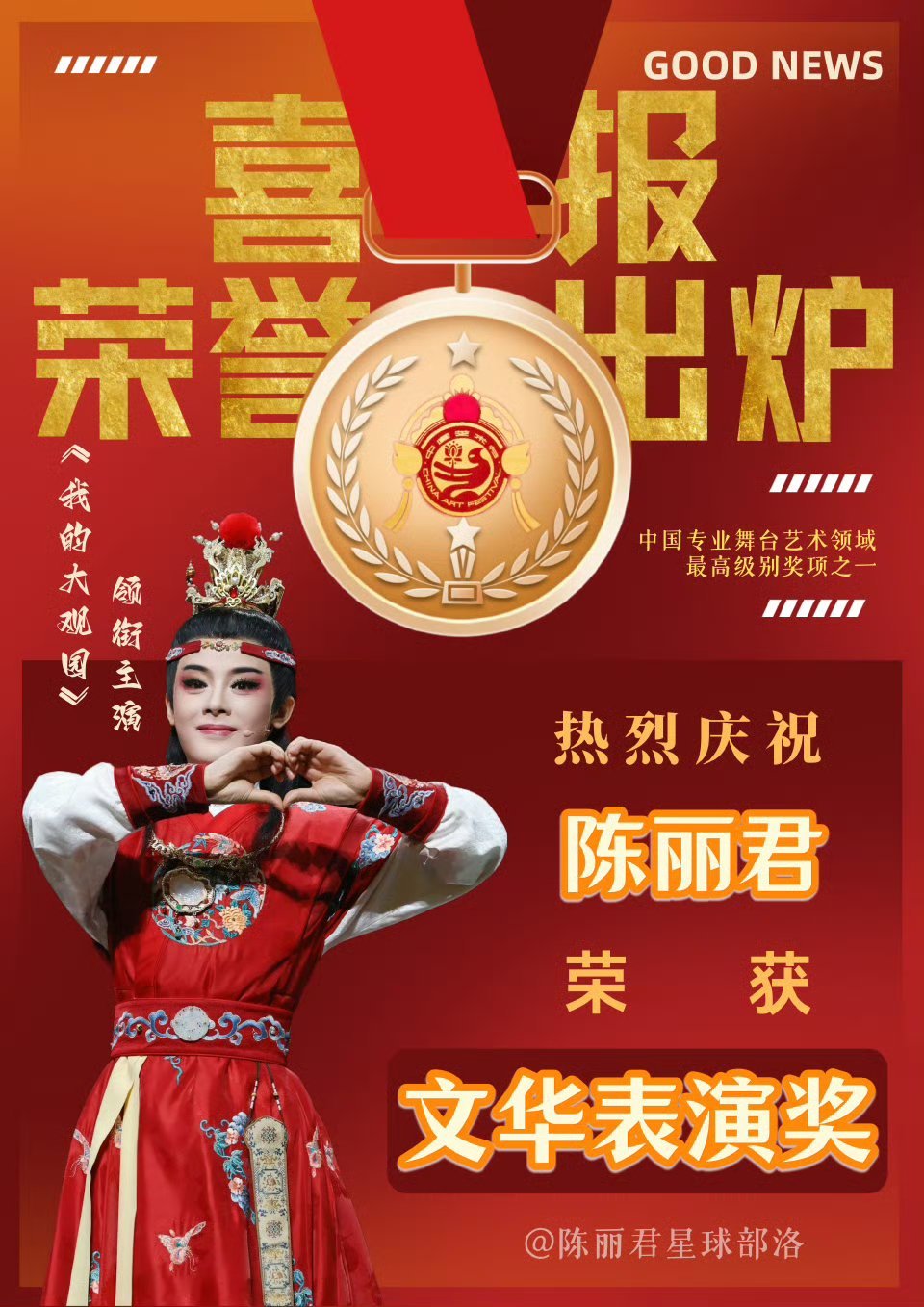 恭喜陈丽君获中国专业舞台艺术领域政府最高奖、文华奖表演奖获得者,实至名归🎉