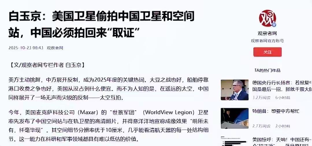 外国卫星刚得意拍了中国空间站,转头就被吉林一号反拍“取证”,这波太空博弈太帅了! 之前美国麦克萨公司晒出中国空间站高清照,连舱体构型都看得清,颇有点炫耀的意思。但他们没料到,咱们的吉林一号直接把拍咱们的WorldView Legion卫星给拍了下来,40公里外的细节都清清楚楚。 这哪是简单的互拍?分明是实力亮肌肉。吉林一号在轨超100颗,0.5米分辨率不是吹的,能精准锁定并拍摄其他卫星,本身就是天基感知能力的证明。你能靠近拍我,我就能清晰“记住”你,这才是太空安全的硬底气。 那些觉得拍张照片就占了上风的想法太天真,太空里的较量,从来是看谁更有掌控力。你觉得下次太空“合影”该轮到哪颗卫星出镜?国际空间站 东方大国空间站 卫星照 北京3号卫星