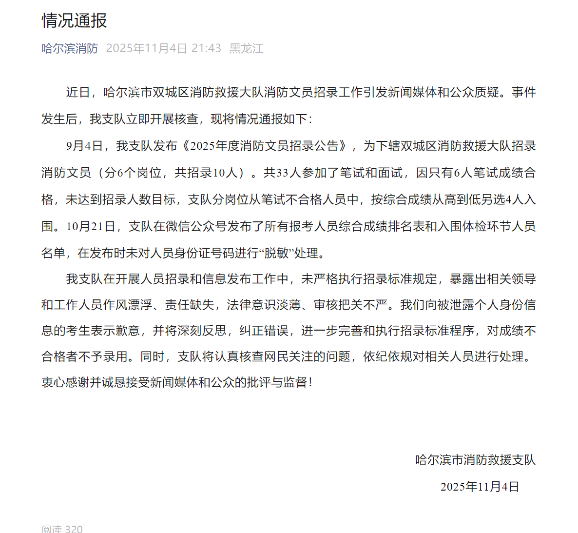【#官方通报消防招录不及格进体检名单#】#哈尔滨消防对成绩不合格者不予录用# 据黑龙江消防救援支队:近日,哈尔滨市双城区消防救援大队消防文员招录工作引发新闻媒体和公众质疑。事件发生后,我支队立即开展核查,现将情况通报如下:9月4日,我支队发布《2025年度消防文员招录公告》,为下辖双城区消防救援大队招录消防文员(分6个岗位,共招录10人)。共33人参加了笔试和面试,因只有6人笔试成绩合格,未达到招录人数目标,支队分岗位从笔试不合格人员中,按综合成绩从高到低另选4人入围。10月21日,支队在微信公众号发布了所有报考人员综合成绩排名表和入围体检环节人员名单,在发布时未对人员身份证号码进行“脱敏”处理。我支队在开展人员招录和信息发布工作中,未严格执行招录标准规定,暴露出相关领导和工作人员作风漂浮、责任缺失,法律意识淡薄、审核把关不严。我们向被泄露个人身份信息的考生表示歉意,并将深刻反思,纠正错误,进一步完善和执行招录标准程序,对成绩不合格者不予录用。同时,支队将认真核查网民关注的问题,依纪依规对相关人员进行处理。衷心感谢并诚恳接受新闻媒体和公众的批评与监督!#官方通报4人笔试不及格仍进体检# ​​​#哈尔滨消防通报考生不及格仍进体检# ​​​