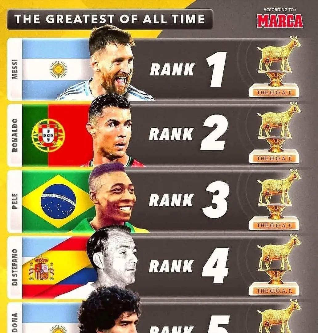 西班牙《马卡报》给足球巨星排座次。 梅西第一、C罗第二、贝利第三、迪斯蒂法诺第四、马拉多纳第五。 这怎么解释?只能说: 梅西史上第一世所公认,也折服了马卡报的投票者们。 毕竟是皇马喉舌,投票者里面也有很多C罗粉丝,就把他抬到了第二的位子。 贝利是第一代球王,最低也第三。 迪斯蒂法诺是皇马传奇,队史最佳,足球史前十牢牢的,投票者偏爱他,就排到了第四。 马拉多纳是第二代球王,和皇马没有渊源,在巴萨效力时间短,和皇马也没什么敌对关系,排第五也正常。 足足三个阿根廷人呐!