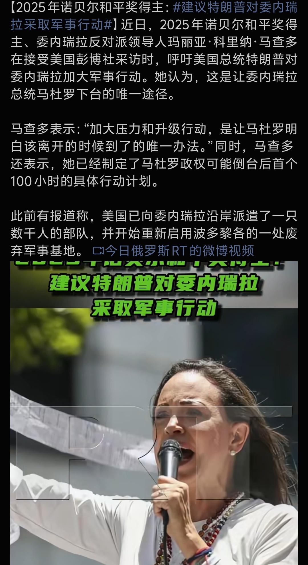 2025年诺贝尔和平奖得主、委内瑞拉反对派领导人玛丽亚·科里纳·马查多在接受美国彭博社采访时,呼吁美国总统特朗普对委内瑞拉对委内瑞拉动武。 这个诺贝尔和平奖得主,让人想起了近代中国的另一历史人物–蒋夫人。 据说,一本名为《交友并据为己有》的回忆录,记载了一则秘闻:美国《展望》杂志的总裁夫人麦克考尔斯在造访台湾时,蒋夫人质问:“你们美国人是笨蛋吗?你们有原子弹,为什么不用它来轰炸ZG大陆?” 而据已故名人李敖的采访,确有其事,询问AI,答复也是真实的。 一个人要外国对自己的国家动武,除非发生非洲卢旺达那种人道主义罪行,否则,很难说你有多爱这个国家。 美国陈兵委内瑞拉 委内瑞拉战局 美陈兵委内瑞拉