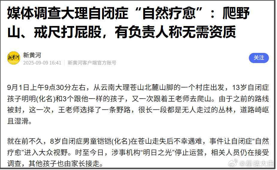 就搜到一个今年9月1日,一名自闭症孩子因为参加了云南大理苍山的一个自闭症“自然疗愈”,负责的所谓“老师”带着小孩去爬野山,结果小孩在爬野山过程里走失后不幸遇难。