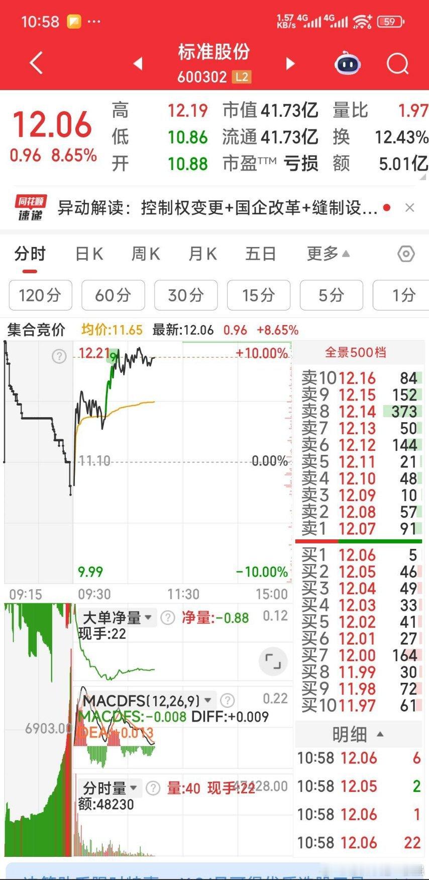 标准股份涨停板价12.21元才挂14133手,看着,我叫朋友给他吃掉。明天开始秒
