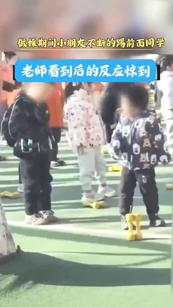 做操期间小朋友不断的踢前面同学,老师看到后的反应惊到。