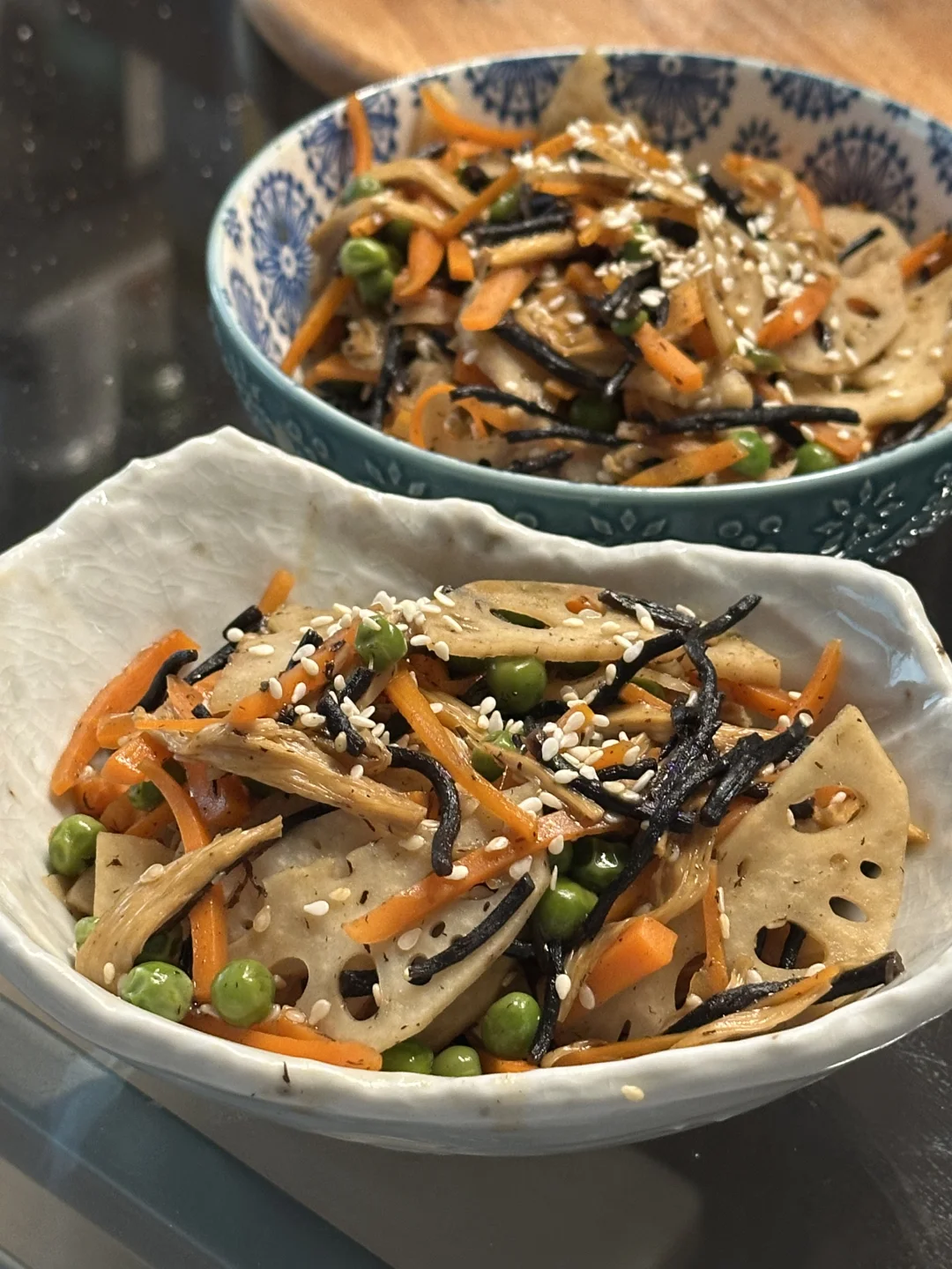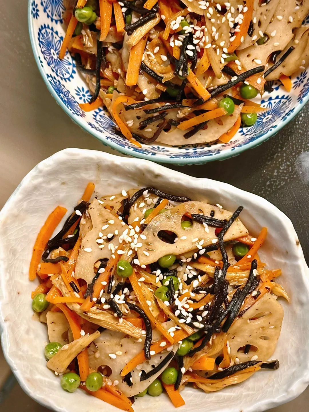 莲藕和胡萝卜自带甘甜爽脆,酱油味淋和芝麻油这调料三剑客,营造出日式料理里经典的咸甜配。羊栖菜是一种日式料理里常用的海藻类食材,不仅营养丰富,而且泡发后多孔的质地特别吸味,非常鲜美。