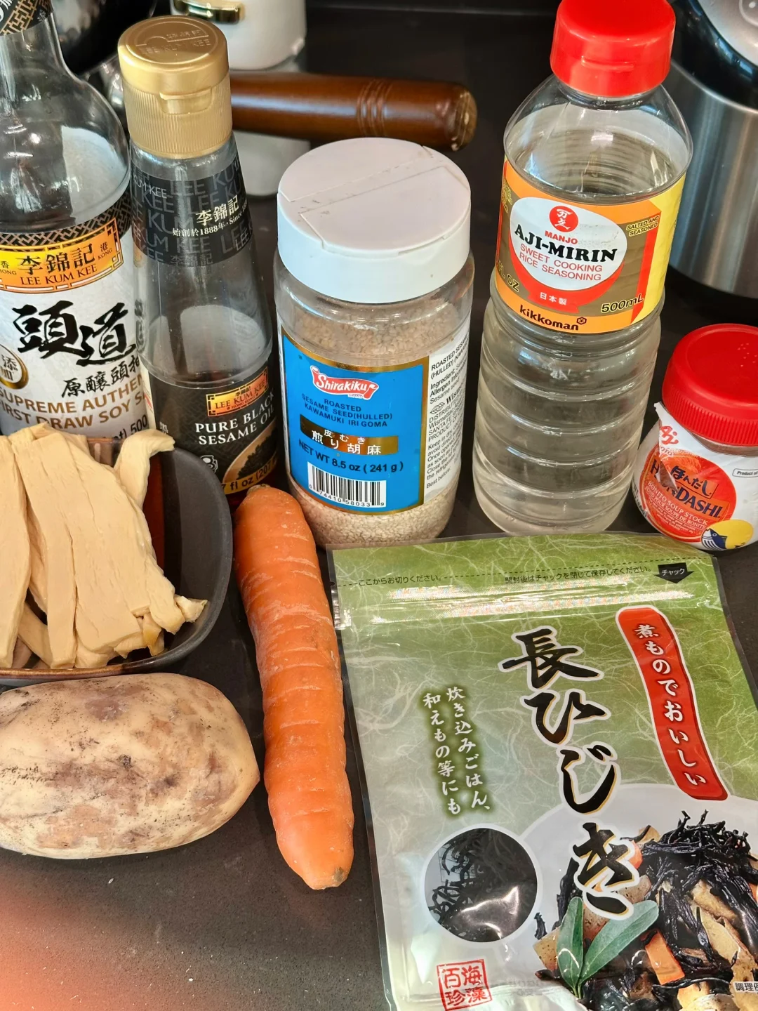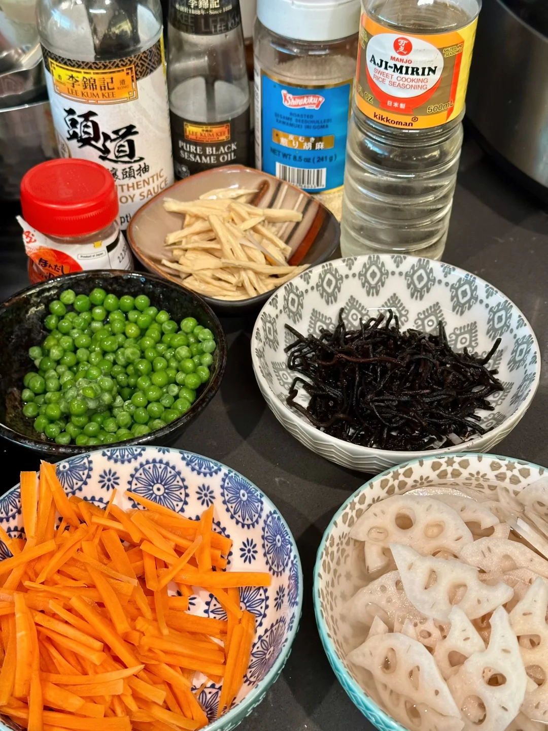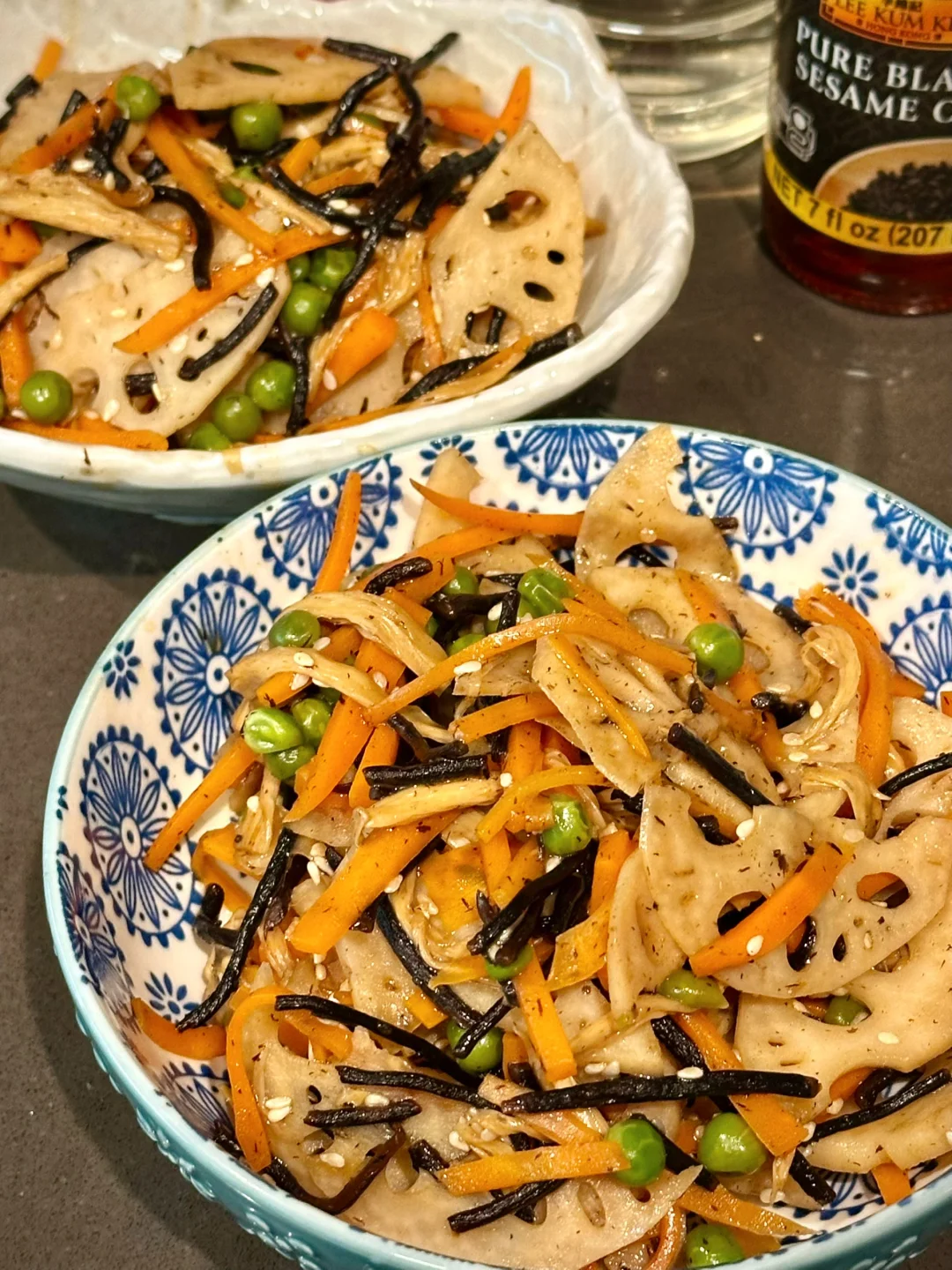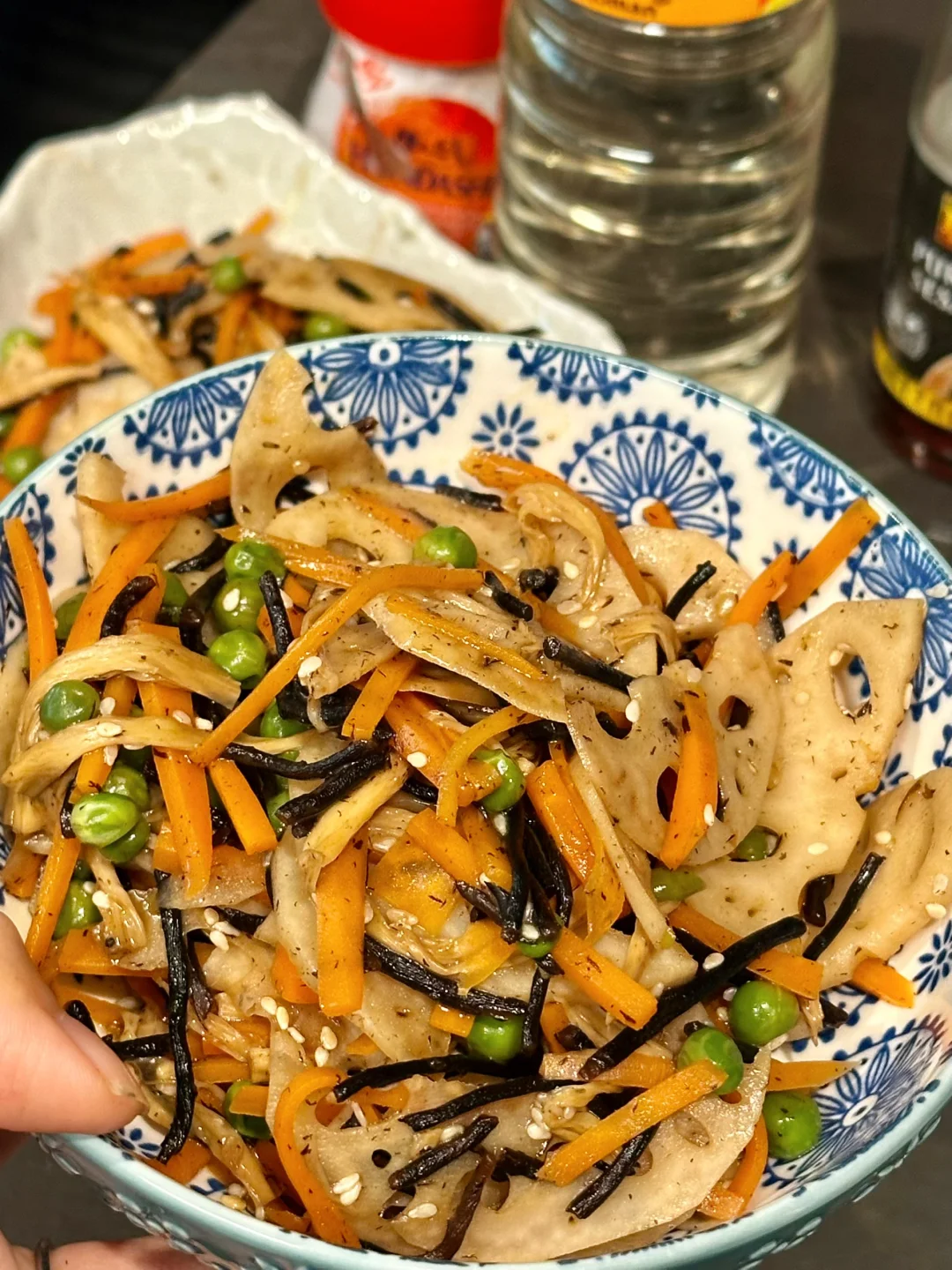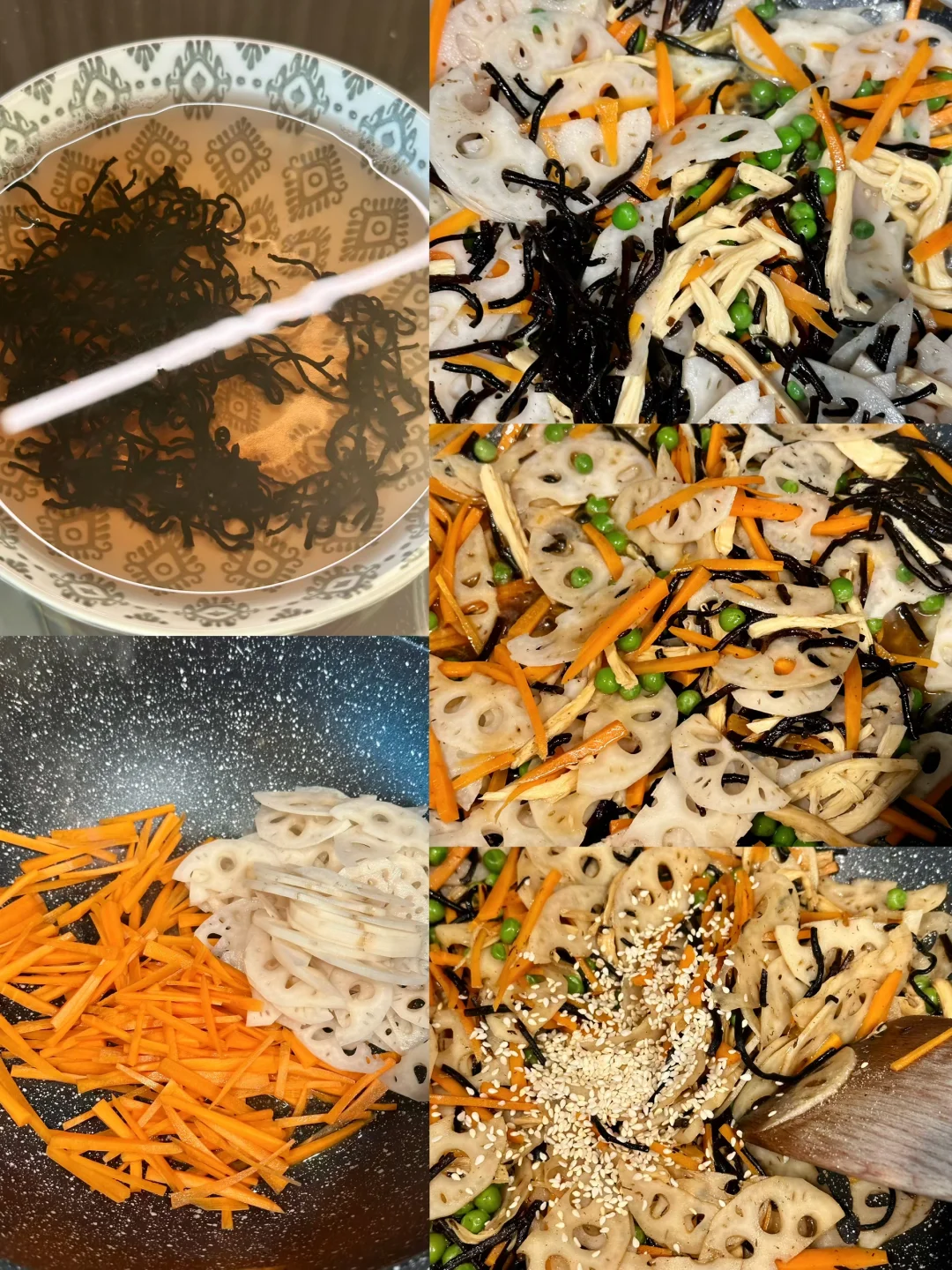 锅里少量油,放入莲藕和胡萝卜丝翻炒一会儿,加入羊栖菜和其他食材,放生抽,味淋,和dashi粉调味,可以加少量水略煮一会儿;