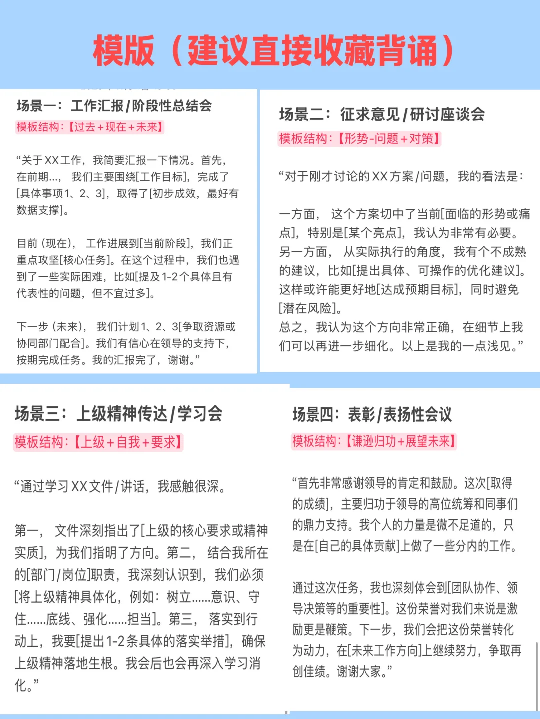 之前写过表达力是在体制内的加分项,对于很多新人,侃侃而谈着实很难,尤其是一些没有准备的即兴场合,不防准备一些万能话术,让你轻松应对。 ▪️通用开场白 “谢谢领导。刚才认真聆听了各位领导/同事的精彩发言,深受启发,我对这个问题有了更全面的认识。下面我结合自己的工作,谈几点不成熟的想法/体会,说得不对的地方,还请各位领导同事批评指正。” ▪️分场景发言模板 ✅场景一:工作汇报/阶段性总结会【过去+现在+未来】 “关于XX工作,我简要汇报一下情况。 首先,在前期..., 我们主要围绕[工作目标],完成了[具体事项1、2、3],取得了[初步成效,最好有数据支撑]。 目前, 工作进展到[当前阶段],我们正重点攻坚[核心任务]。在这个过程中,我们也遇到了一些实际困难,比如[提及1-2个具体且有代表性的问题,但不宜过多]。 下一步, 我们计划1、2、3[争取资源或协同部门配合]。我们有信心在领导的支持下,一定按期完成任务。我的汇报完了,谢谢。” ✅场景二:征求意见/研讨会【形势问题+对策】 “对于刚才讨论的XX方案/问题,我的看法是: 一方面, 这个方案切中了当前[面临的形势或痛点],特别是[某个亮点],我认为非常有必要。 另一方面, 从实际执行的角度,我有个不成熟的建议,比如[提出具体、可操作的优化建议]。这样或许能更好地[达成预期目标],同时避免[潜在风险]。 总之,我认为这个方向非常正确,在细节上我们可以再进一步细化。以上是我的一点浅见。” ✅上级精神传达/学习会:【上级+自我+要求】 “通过学习XX文件/讲话,我感触很深。 第一, 文件深刻指出了[上级的核心要求或精神实质],为我们指明了方向。第二, 结合我所在的[部门/岗位]职责,我深刻认识到,我们必须[将上级精神具体化,例如:树立……意识、守住……底线、强化……担当]。第三, 落实到行动上,我要[提出1-2条具体的落实举措],确保上级精神落地生根。我会后也会再深入学习消化。” ✅表彰/表扬性会议 见图6(缩略) 总之,一场精彩的发言就4点:心态稳、接得住、有逻辑、显担当 👩今日份穿搭:粗棒线毛衣搭配一件宽松深色牛仔裤,内搭白色衬衫,搭出层次感,又不失精神气,黑色桶包绿色内衬,点缀提亮,整体风格简洁利落。