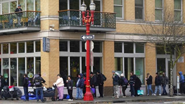 11月4日,在美国俄勒冈州波特兰,等待领取免费食物的人们在街头排起长队。新华社发