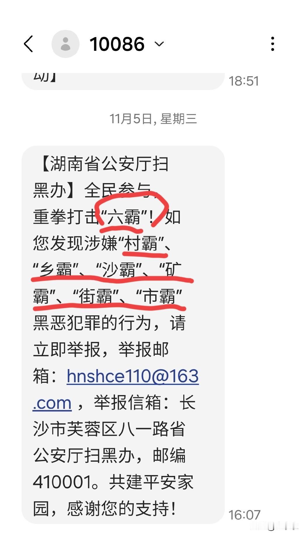 我经常听的是黑恶霸,黑势力 刚给我发的短信,头次听说有 乡霸,沙霸,市霸,街霸,矿霸,这种说法, 我有点孤陋寡闻 [捂脸][捂脸][捂脸] 【湖南省公安厅扫黑办】全民参与,重拳打击“六霸”!如您发现涉嫌“村霸”、“乡霸”、“沙霸”、“矿霸”、“街霸”、“市霸”黑恶犯罪的行为,请立即举报,举报邮箱:hnshce110@163.com ,举报信箱:长沙市芙蓉区八一路省公安厅扫黑办 深入惩治村霸 网络村霸 湖南村霸王