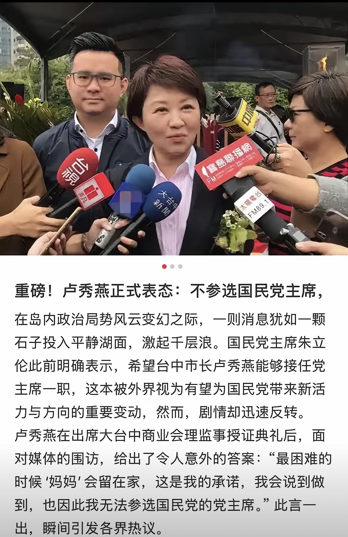 卢秀燕这声“隔空喊话”哪是开炮,分明是给国民党留了条活路!说“抱住中间选民”可不只是经验之谈, 她自己靠“少谈政治多做实事”的路子,把台中经济干到全台前三,满意度第一,这就是最硬的底气。2024大选输得有多冤?六成民意想下架民进党,就因为侯友宜抓不住中间票,被柯文哲截胡了年轻人选票。郑丽文现在刚上位,一边要平衡党内派系,一边还背着21亿负债,要是真扎进深蓝堆里,等于把中间选民拱手让给民众党。 卢秀燕这招既点醒了 party ,又为自己2028铺路,简直是一举两得。但郑丽文会不会听?不好说,她虽在拢派系,但“战斗派”底色能不能兼容中间路线还是未知数。 国民党的核心从来不是硬不硬气,是懂不懂民心。你觉得郑丽文能接住卢秀燕抛的橄榄枝吗?来评论区聊聊~