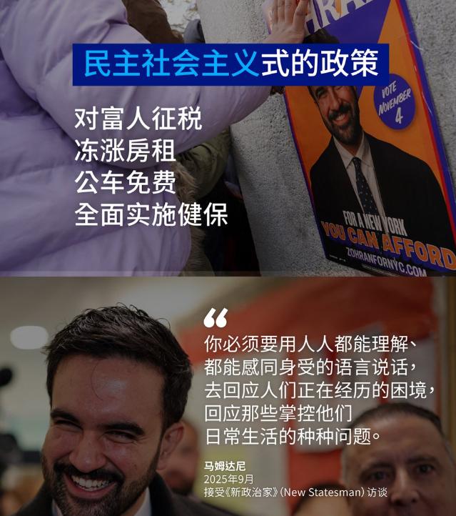 确实有点抽象了,在那个号称“资本主义灯塔”的纽约,竟然被一个新选出来的34岁自称“民主社会主义者”的市长佐赫兰·马姆达尼,给接管了。 这个选举结果很有冲击力,不仅因为他以大约五成的得票率击败了曾经的州长、深陷性丑闻的科莫,更在于他打破了好几项纽约政坛的百年纪录:他是纽约历史上最年轻的市长,还是首位穆斯林、首位南亚裔、首位出生于非洲的市长。从他的身份到他的意识形态,都预示着纽约,乃至整个美国,正在经历一场从内到外的剧烈思想动荡。 马姆达尼的胜利绝非偶然,它是纽约社会矛盾积累到极致的一次大爆发。这位从昆斯州议员一路走来的草根政治明星,紧紧抓住了普通市民对高昂生活成本绝望的这一痛点,提出的政纲简直是对华尔街的公开“宣战”:要向富人增税,冻结租金,甚至提出要搞市营超市来对抗高物价,还要让公交车免费! 在那个遍地是摩天大楼和金融巨头的城市心脏,他这套“让政府降低成本,让生活更容易”的左翼主张,瞬间点燃了无数被房租和物价压垮的年轻人和工薪阶层的怒火。 有意思的是,马姆达尼的崛起被视为对传统政治精英的一次彻底反叛。他几乎是靠着小额捐款和数万志愿者的草根力量,打赢了这场选战,甚至在选举之夜的胜选演讲中,还公开向正在看电视的特朗普喊话:“把音量调大点!” 这种毫不掩饰的对抗姿态,让他成了美国进步派的新旗手。 不过,特朗普的回应也非常直接,他称马姆达尼是“共产主义疯子”,甚至威胁一旦他当选,就要削减对纽约的联邦资金。 这次纽约市长选举堪称一个绝佳的观察窗口,当美国最富有的城市都开始寻求带有“社会主义”色彩的激进方案来解决贫富悬殊问题时,这说明美国的贫富差距和阶级固化已经病入膏肓。 一个缺乏施政经验的年轻政治家,如何在资本的围剿、庞大的官僚系统和巨大的财政压力下,兑现他那些听起来太过美好的承诺?这不仅将考验他的政治智慧,也将决定纽约这个全球金融中心的未来走向,大家等着看戏吧。