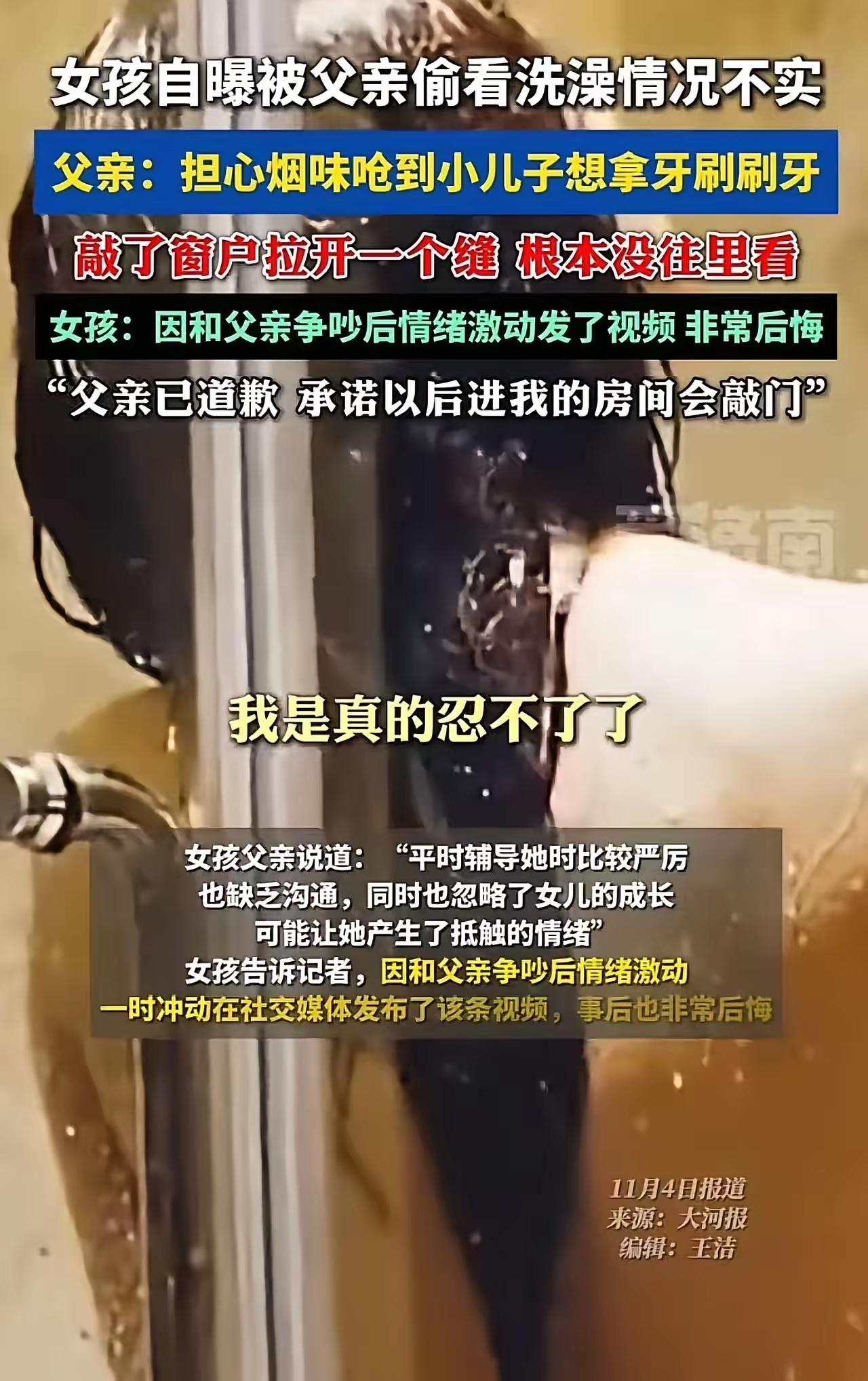 河南女孩发视频称父亲四次偷窥洗澡,事件一石激起千层浪。视频中,女孩语气哽咽,控诉父亲的不当行为,甚至提到母亲也在现场,似乎也在指责父亲的不妥。这一幕,瞬间点燃了公众的敏感神经——家庭的底线被触碰,信任的天平摇摇欲坠。 相关部门迅速做出回应,称这是“口角矛盾产生误会”。然而,网友们的担忧并未因此平息。有人质疑:误会?还是掩盖?视频里母亲在旁边,态度似乎也在指责父亲,难道真有那么单纯的误会?还是家庭中的隐秘角落被无意中揭开?网络上,关于家庭暴力、父母信任危机的讨论再次升温。 这件事折射出一个深刻的社会现象:我们对家庭隐私的敏感度,与对家庭成员之间信任与责任的复杂关系。很多时候,家庭中的矛盾被压抑在角落,谁也不愿意面对真实的痛点。面对类似的质疑和指控,很多家庭选择“宁愿相信自己所看到的误会”,而不是深挖真相。这种“误会”的背后,隐藏的是多大的隐忍与压力?又有多少家庭,正处于这样的“误会”中,而不自知? 网友们的担忧也并非无的放矢。毕竟,家庭是每个人最基本的港湾,却也是最容易被忽视的战场。有人说:“如果是真的,父亲的行为怎么能轻描淡写地用‘误会’来解脱?”有人则担心:“这只是个表象,背后可能隐藏着更深的家庭裂痕。”在关注事件的同时,我们不禁反思:社会对家庭暴力和性骚扰的认识还远远不够?家庭成员之间的沟通机制为何如此脆弱?而公众的关注,是否能成为推动家庭和谐、保护弱者的力量? 这起事件也让我们意识到,每个家庭都像是一面镜子,映照出社会的多重问题。我们不能只看表面,更要洞察人性中的善与恶、信任与背叛。面对家庭中的“误会”和“矛盾”,我们是否应该用更多的理解与包容,而不是简单的指责和偏见?毕竟,家庭的和谐,关系到每个人的幸福,也是社会稳定的重要基石。 读到这里,你是否也在心里默默问自己:如果是我,面对这样的指控,我会选择相信家人,还是要追求真相?在这个信息爆炸、真假难辨的时代,我们更需要理性与善意,共同守护那个本应温暖、安全的港湾。毕竟,只有真相和理解,才能让家庭的灯火长明,照亮每一个被误会包裹的心。
