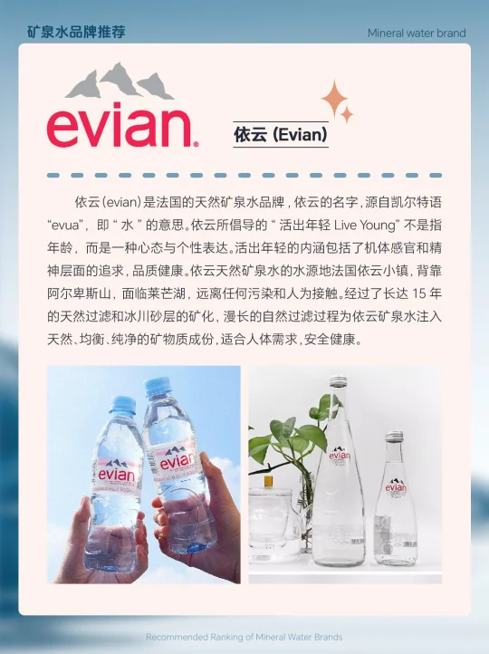 在当代消费语境里,矿泉水早已不只是解渴的功能性饮品。它成为身份、审美与生活方式的隐喻。不同品牌的水,藏着不同的故事与段位。今天,就来聊聊这份全球矿泉水段位榜: