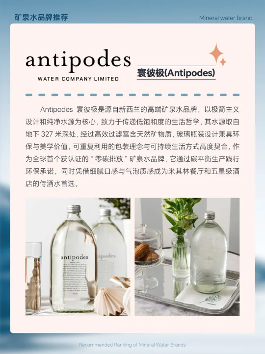 与高奢组并肩的高端组,是同样来自新西兰的Antipodes寰彼极。它讲究的是极简、优雅与环保的平衡。凭借和Oravida相似的低矿物质、极软口感,成为追求纯粹饮水体验的皇后。在米其林餐厅、精品酒店里,它以不喧宾夺主的姿态,衬托着美食的美好。