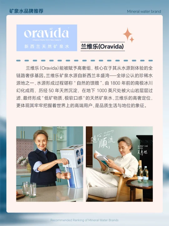 新西兰水的巅峰,当Oravida兰维乐莫属。你很少在普通超市见到它,只可能在顶级的奢华酒店如华尔道夫、瑰丽,或顶级的餐厅如泰安门、新荣记与它相遇。从吴彦姝代言后,Oravida一下子从新西兰国宴走入国内视野,她身上那份历经岁月沉淀的从容气度,恰如这瓶水所诠释的纯净传奇,不必张扬,自有光华。