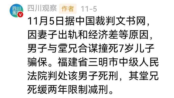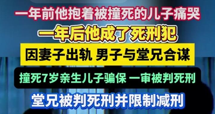 虎毒还不食子呢,这人简直禽兽不如! 这两天,一桩没人性的案子在网上炸开了锅:一个当爹的,为了骗巨额保险金,居然和堂哥合伙,精心策划了一场车祸,活活撞死了自己才7岁的亲生儿子! 调查发现,这男的给儿子买了好几份意外险,保额加起来上百万。作案前,他跟堂哥反复商量,把每个细节都盘算好了,最后挑了个没监控的偏僻路段下手。案发那天,堂哥开车直接撞向小男孩,孩子当场就没了。而这个亲爹,还装成“悲痛欲绝”的样子,想以“意外事故”的名义去骗保。 可警方越查越觉得不对劲:事发地方明明没什么监控,肇事车却像算准了一样出现在孩子经过的路上;这男的在事发后冷静得可怕,还不停催保险公司赶紧赔钱。最后在审讯中,堂哥扛不住了,心理防线彻底崩溃,交代出了这场骇人听闻的阴谋。 孩子做错了什么?偏偏投胎到这种家! 更让人心疼的是,孩子生前好几次跟邻居说:“爸爸说我只要听话,以后就能过上好日子……” ——人心到底要坏到什么程度,才会做出这样的事?