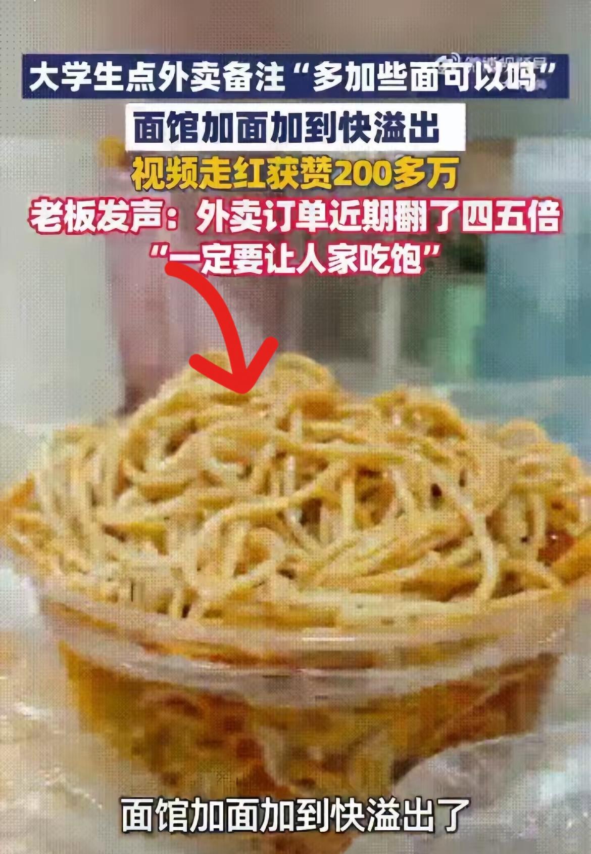 湖北武汉一个大学生点外卖时,特意备注了“可以多加点面吗,我老是吃不饱”,本以为老板不会在意,谁料大学生拿到外卖后,却发现盒子里的面满得都要溢出来了,很明显是老板多加了很多面。 于是大学生拍下视频并上传到网络,结果一下子让这家店的销量暴涨了4倍,对此老板表示,我的初心就是,一定要让顾客吃饱。 这个大学生后来在评论区补了细节:自己每个月生活费刚够一千二,扣掉话费、日用品,每天吃饭预算攥在二十块以内。点这份面是因为它单价最低,备注的时候打了又删——怕老板嫌他事儿多,也怕被当成占便宜的人。 老板是个四十出头的湖北汉子,接受采访时围裙上还沾着面汤印。他说自己二十年前在武汉读专科,最穷的时候一顿只敢买两个馒头,就着免费面汤咽下去,饿到晚上翻来覆去睡不着。“那备注一看就懂,娃不是贪便宜,是真不够吃。面才几个钱?多抓两把的事儿,总不能让他吃半饱去上下午课吧?” 大家疯转这个视频,不是馋那碗堆得冒尖的面,是馋这份被人接住的妥帖——现在不少商家把“标准化”挂在嘴边,菜量卡得精准到克,备注里的“少辣”“多醋”都未必能落实,这种“超标准”的热乎气,才戳中了太多人的软处。 其实这事儿哪是什么“爆款营销”?就是一个走过苦日子的人,看见另一个人的难,顺手递了把台阶。我们每天被生活催着赶,总觉得“温暖”是要花大钱、费大力气的事儿,可这个武汉面馆老板偏偏告诉你:温暖就是多抓两把面,就是看见别人没说出口的窘迫,往心里放一放。 它不是什么惊天动地的善意,却能让一个饿肚子的学生暖半天,让一群走过穷日子的人,想起自己被温柔对待的时刻。 这个故事之所以能戳中这么多人,就是因为它展示了商业社会里稀缺的人情味。如果你也想分享类似的温暖瞬间,我可以帮你整理一份暖心文案,让你能更好地记录和分享这份感动。需要吗?