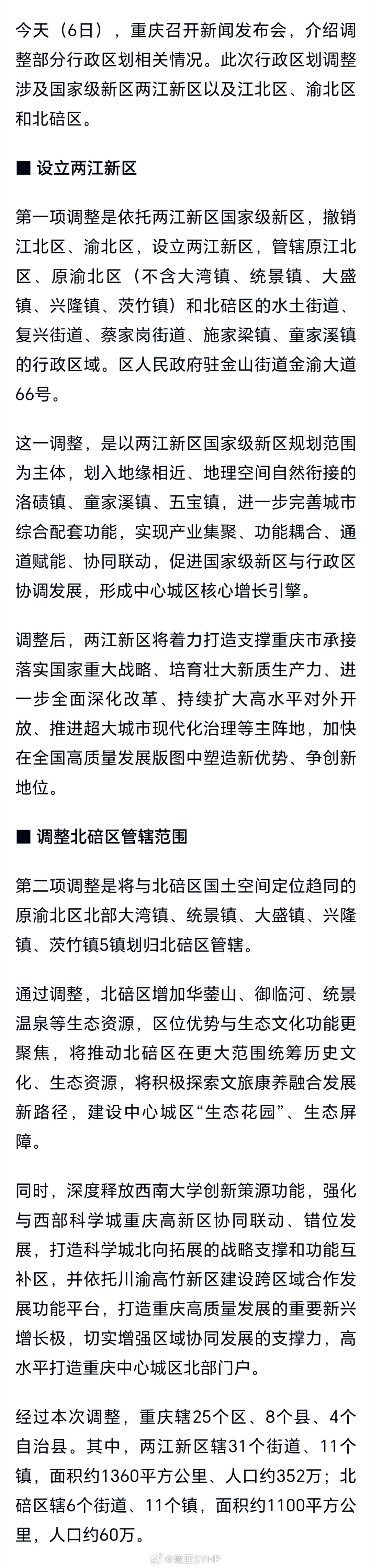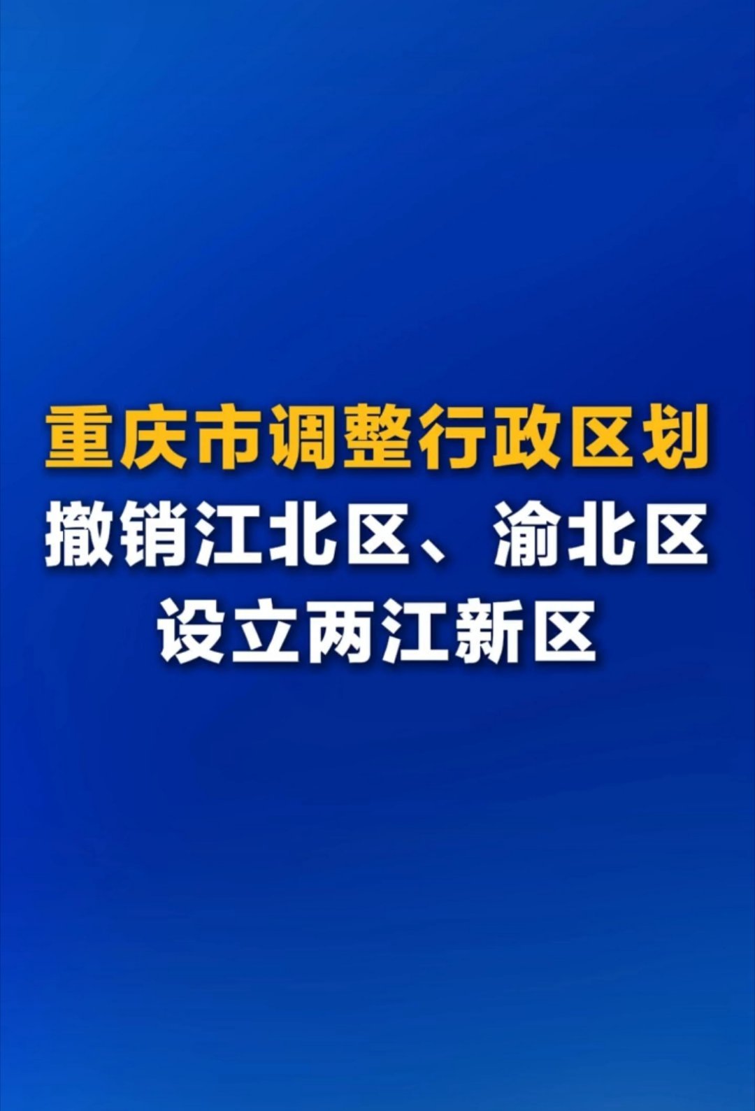 重庆市调整部分行政区划重庆撤销江北区渝北区设立两江新区今天,重庆召开新闻发布会,介绍调整部分行政区划相关情况。此次行政区划调整涉及国家级新区两江新区以及江北区、渝北区和北碚区。
