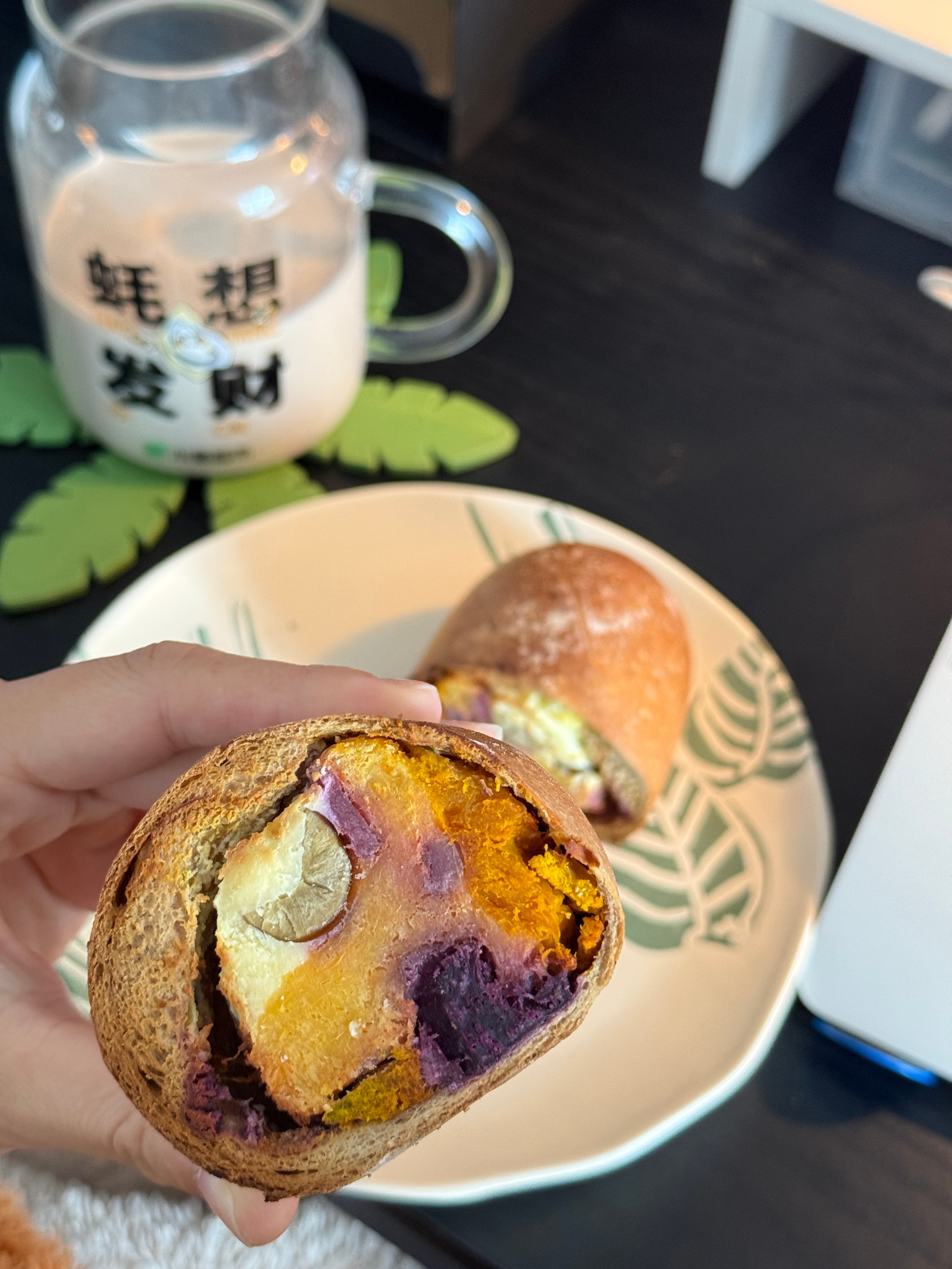 里面夹着红薯紫薯南瓜板栗奶酪馅儿!一口下去口感老丰富了!各种粗粮混合起来的绵密口感➕奶酪的醇香!喜欢这种的朋友可以搜搜全麦乳酪果蔬欧包!我就是在买菜软件上买的!