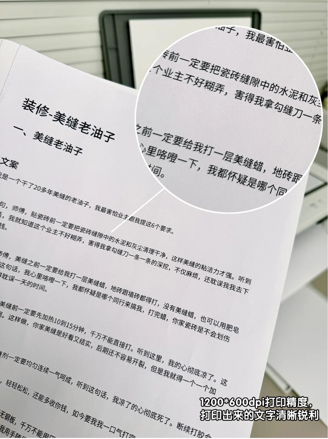 ✅ 打印效果不错,1200*600dpi打印精度,打印出来的文字清晰锐利,图像线条流畅,重要合同存档都没问题。
