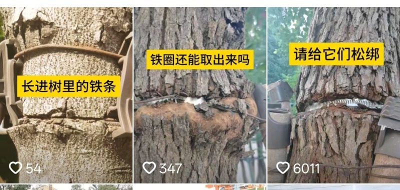 此事源于11月5日有网民接连发布多条视频称,苏州相城经开区(澄阳街道)路边有一些行道树有支架,并套有金属卡箍,如今已嵌进树干,呼吁相关部门给树木“松绑”,引发热议。有网民认为,这些勒痕的存在对树木是一种伤害,不利于生长,还有人留言希望相关部门尽快处理。