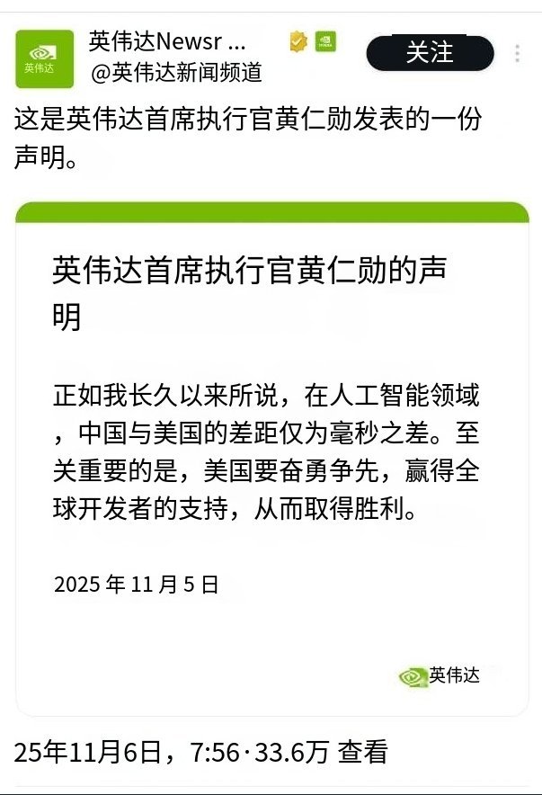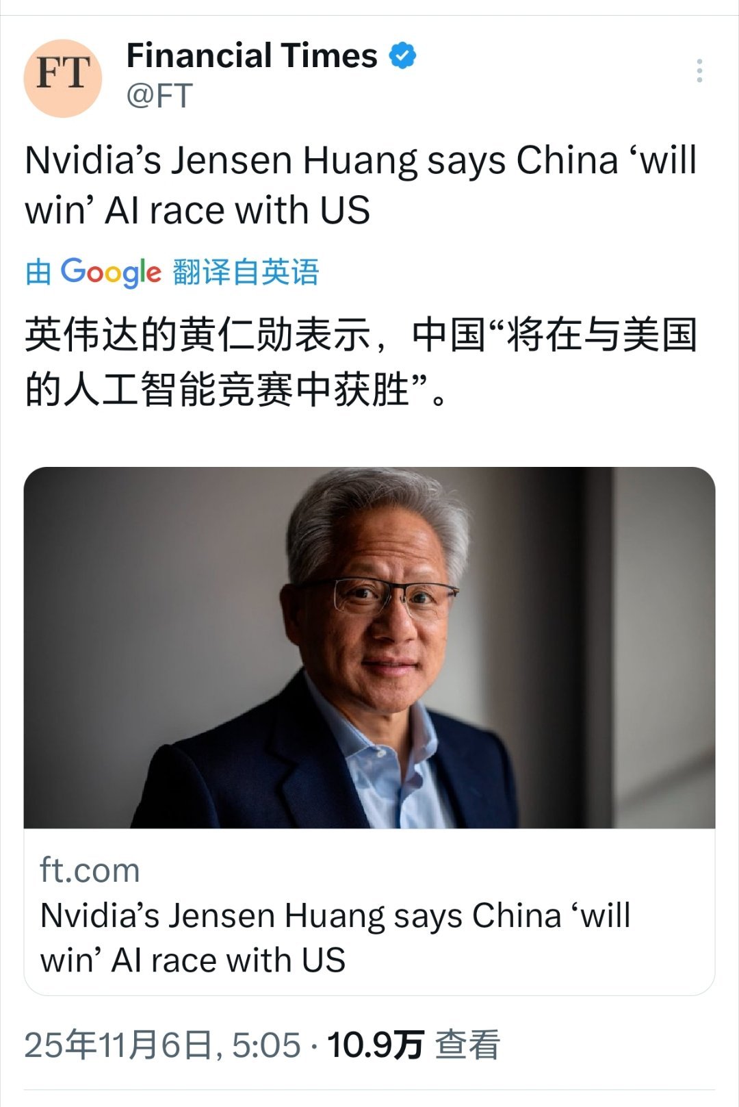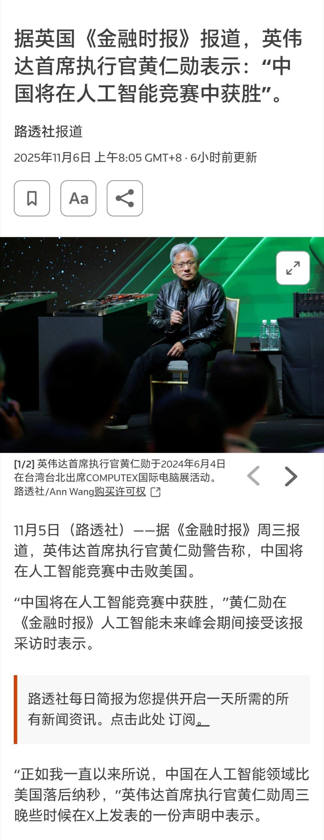 英国《金融时报》报道,英伟达首席执行官黄仁勋表示:中国将在人工智能竞赛中获胜。黄仁勋称中国将在人工智能竞赛中获胜