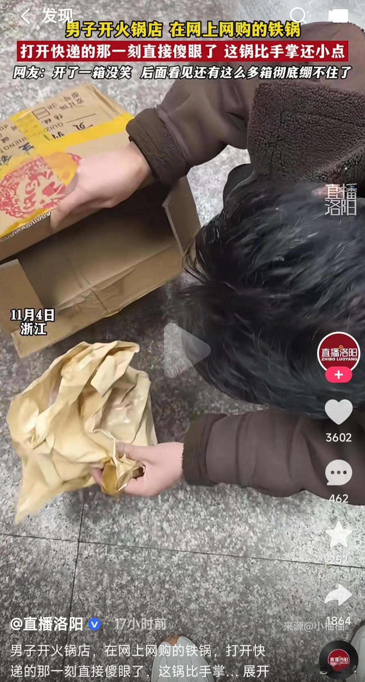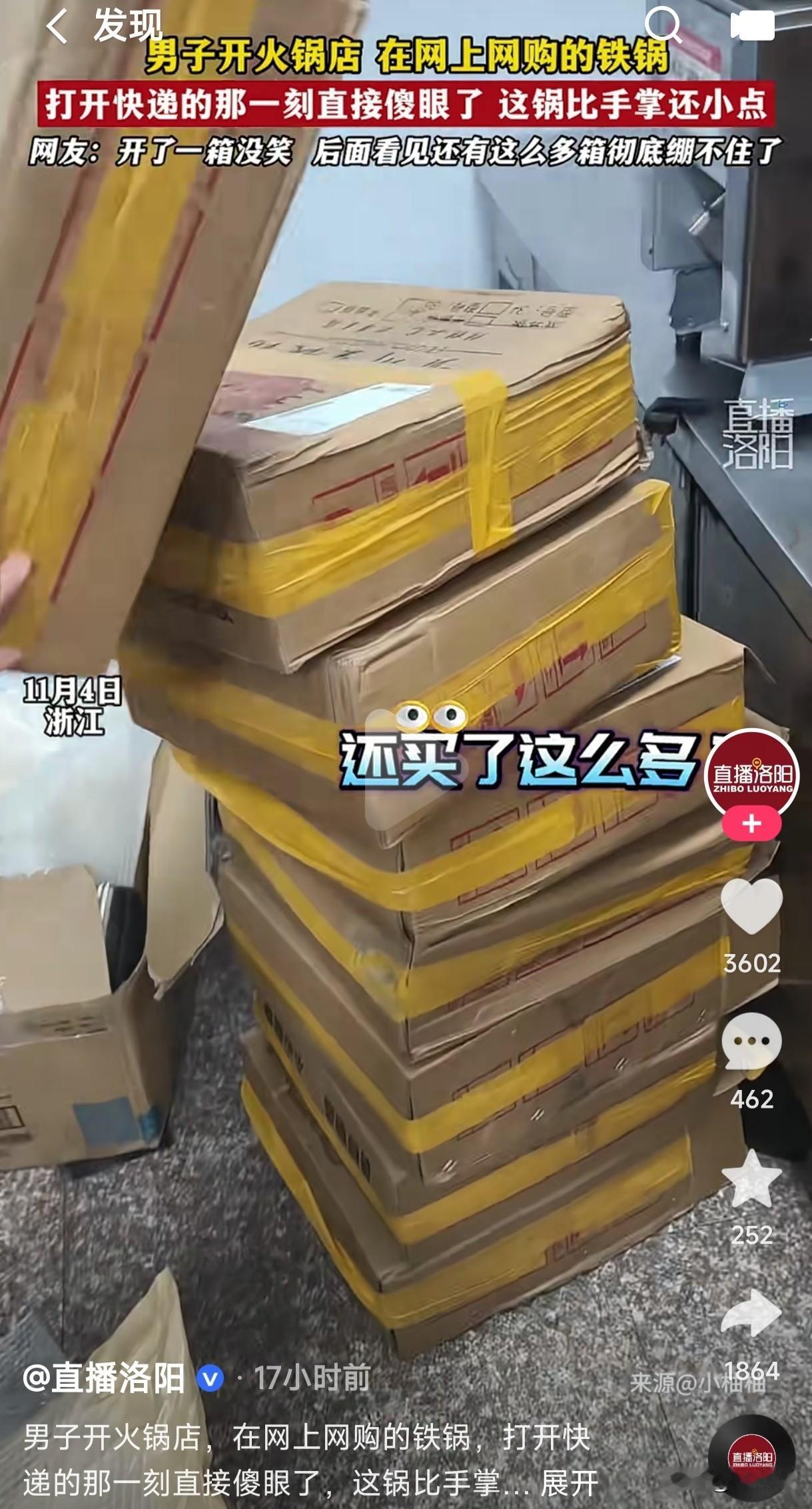 男子开火锅店,在网上购买了铁锅,结果到货后打开一看傻眼了,那么大的纸箱里面层层包裹着指甲盖那么大点的锅,这是购买的还没满月的锅吗? 这不知是在那个平台的直播间抢购的良心价铁锅,这指甲盖大小的锅,让小孩子拿去玩泥巴估计都会嫌弃吧,关键是它太小了,网友们看到这锅也遐想不断,纷纷猜想这是为了图便宜没看大小买的锅,以为这男子只买了一个,当看到还有那么多的箱子时,瞬间绷不住了,这是占小便宜吃了大亏啊,这到底怪男子图便宜上当了?还是商家明显的是在坑人?