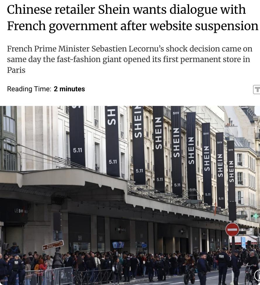 外媒:中国快时尚巨头希音(Shein)在法国的网站被暂停后,希望与法国政府进行对话。 法国总理塞巴斯蒂安·勒科尔努下令暂停Shein平台,原因是该平台未能完全符合法国的法律法规。Shein表示尊重法国政府的决定,并承诺将与法国当局合作,迅速解决任何问题。此次网站被暂停的决定是在Shein在巴黎开设首家实体店的同一天宣布的。 法国政府要求Shein在48小时内提交初步整改报告,并表示该措施将一直有效,直到Shein能够证明其内容完全符合法国法律为止。