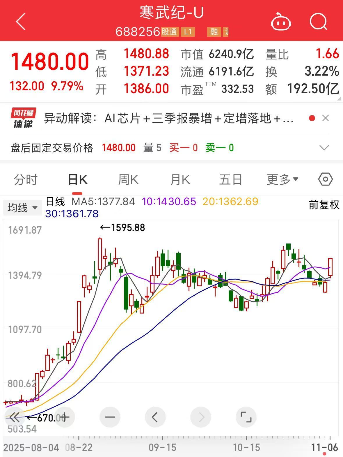 10月以来,寒武纪再次经历一波上涨,10月24日,寒武纪报1525元/股,上涨9.01%,再度超越贵州茅台,时隔一段时间重夺A股“股王”宝座。
