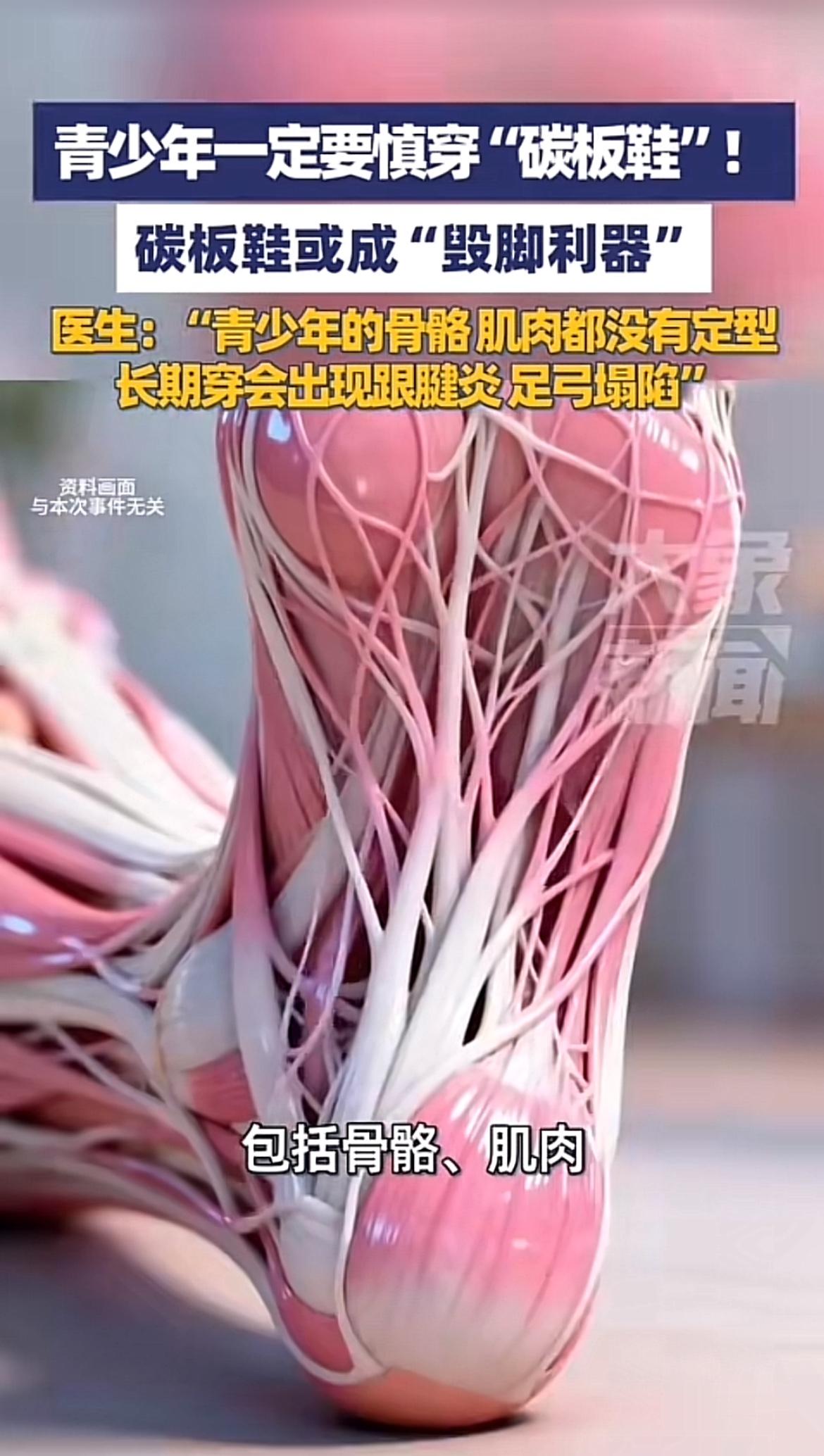 现在碳板跑鞋这股风都吹进中学校园了。好多家长在社交平台吐槽,孩子跟风非要买碳板跑鞋。这碳板跑鞋能提供额外反弹和加速能力,被当成提升运动表现的“黑科技”。 但青少年穿碳板鞋危害可不小。15岁孩子足部还在发育,碳板鞋硬底和紧密贴合会造成足部不适或疼痛,长期穿还可能影响足部正常发育,导致变形,影响走路姿势。而且,在不适合的场合穿,运动损伤风险也会增加。之前就有跑步爱好者穿它患上足底筋膜炎,还有孩子穿了脚掌疼、脚后跟无法着地。青少年还是慎穿碳板鞋,家长可得给孩子选合适的鞋。