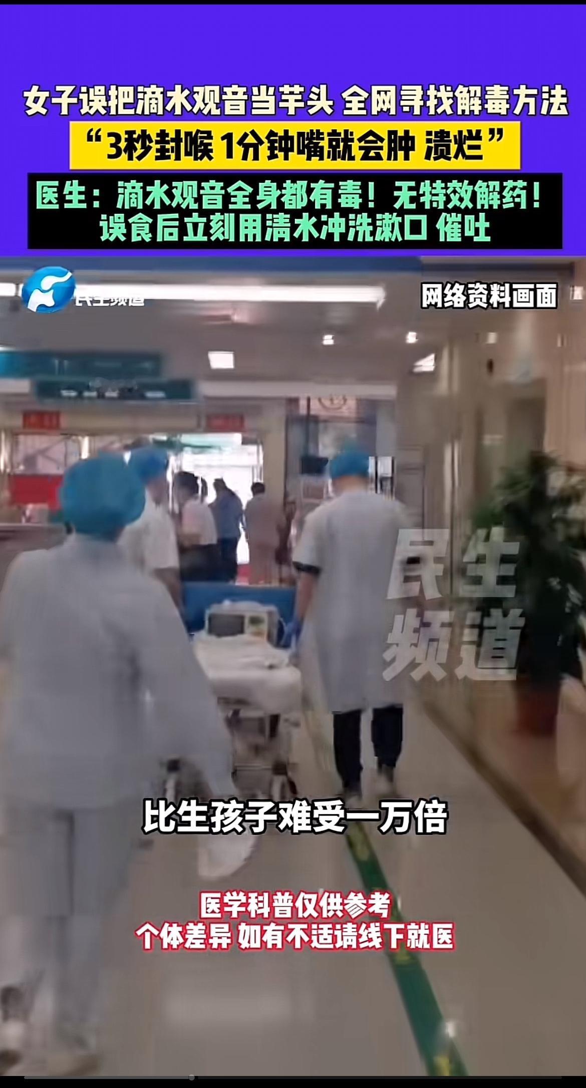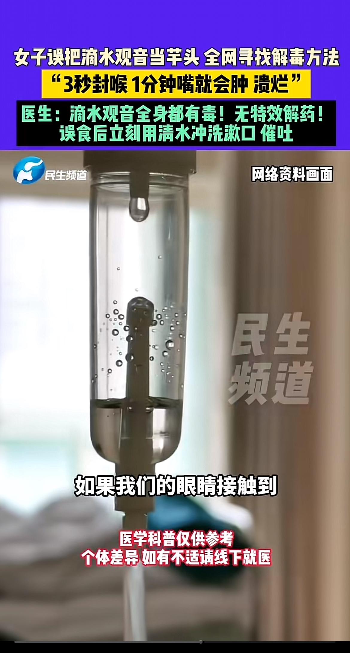 最近女子误把滴水观音当作芋头吃而全网找解毒方法的事儿可太惊险了。温州王女士丈夫带回像芋头的植物,她舔了下白色区域就中招,舌头、口周麻木,四肢也麻,还流口水、咽喉灼烧、恶心呕吐,经医院1小时口腔冲洗才缓解,原来那是滴水观音。 还有厦门一女子煮“芋头”吃一口就嘴麻胸闷,送医后才知吃的是滴水观音。今年2月也有游客好奇舔了下,口唇发麻、话都说不了。滴水观音全株有毒,根茎和芋头像,大家可得擦亮眼睛,别误食了!
