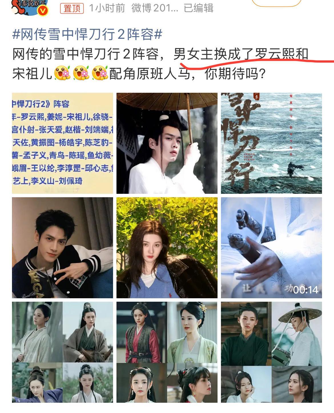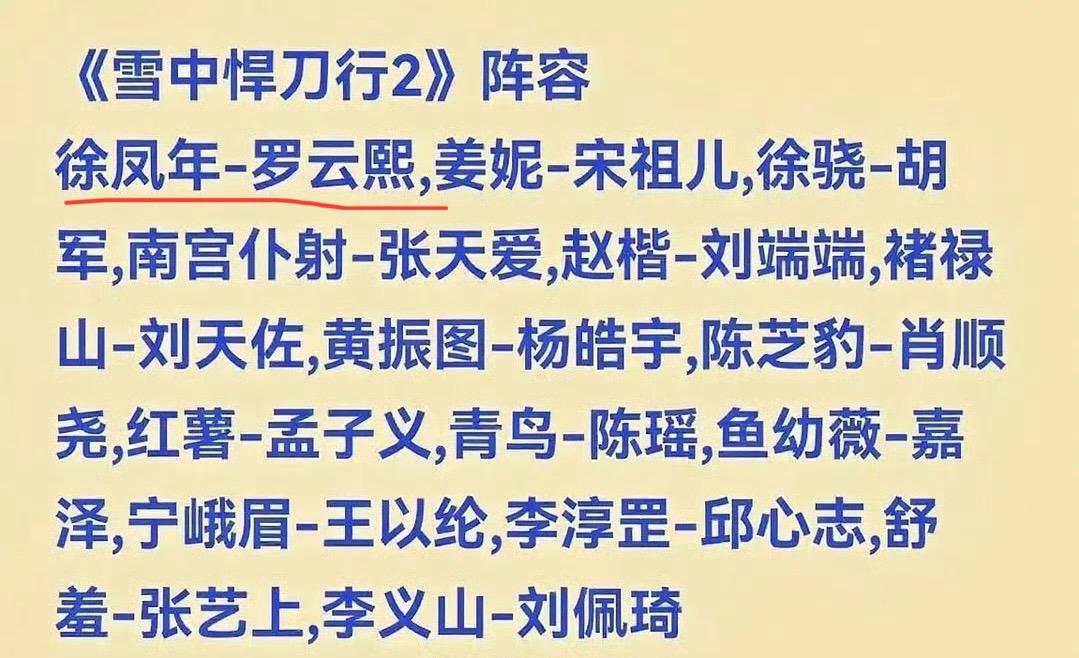 不是吧,罗云熙要演《雪中悍刀行》第二季?张若昀不演了? 前段时间,《雪中悍刀行2》发布了概念海报,这也代表着这个项目即将启动了。 大家都以为第二季还是张若昀出演徐凤年,现在居然有瓜主爆出罗云熙出演男主,宋祖儿出演女主,这对吗? 《雪中悍刀行》第一季的打戏虽然备受吐槽,但该剧近年来常年霸占鹅厂N刷榜前列,这就证明第一季是成功的。 如果第二季换了主演,难保不会扑街。经常看剧的朋友都应该知道,往往第二季、第三季更换主演的剧,基本上都会扑街。 再说了,罗云熙这个小身板演侠客,会不会有点不合适啊。罗云熙那么瘦,感觉风一吹就会倒,怎么和武林高手对决过招呢!