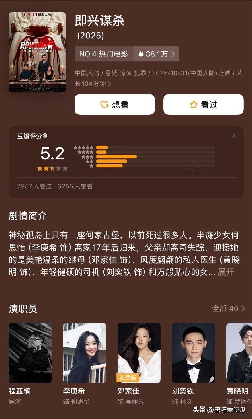 原来不止黄晓明 是大家都不看了 今年除了哪吒,其他电影都扑了,辛芷蕾的《日挂中天》首日票房106万,舒淇的《女孩》125万,黄晓明的《阳光俱乐部》总票房700万,《即兴谋杀》3000万出头,票房都低得可怕。 今年亮点电影酱园弄大咖云集也只拿了3.7个小目标,可能了演员片酬都不够。 现在不是市场不行,而是观众都不感兴趣了,拿真金白银去支持,结果电影拍的什么样,在一个房子里拍完整部戏的《满江红》,减肥纪录片《热辣滚烫》,观众是不想当韭菜了,让他们明星都去包场支持。