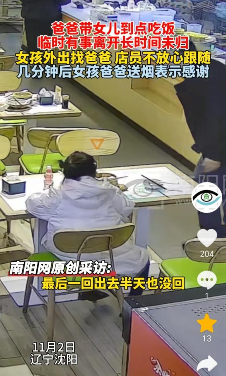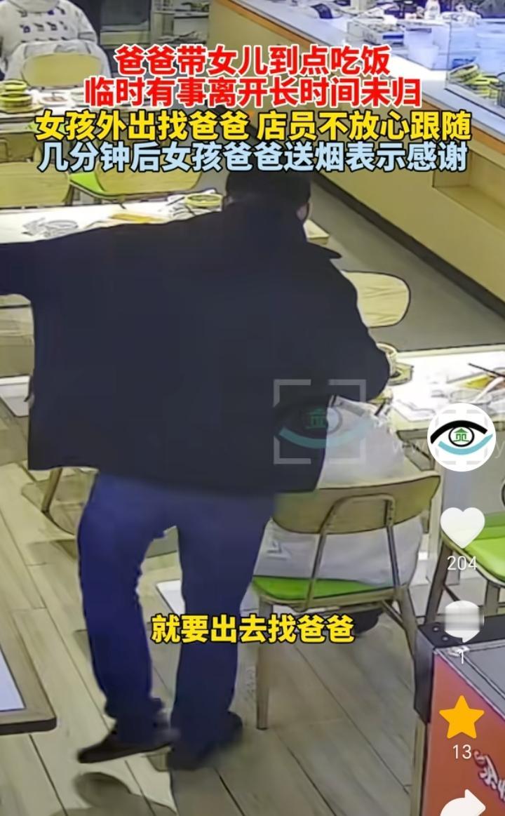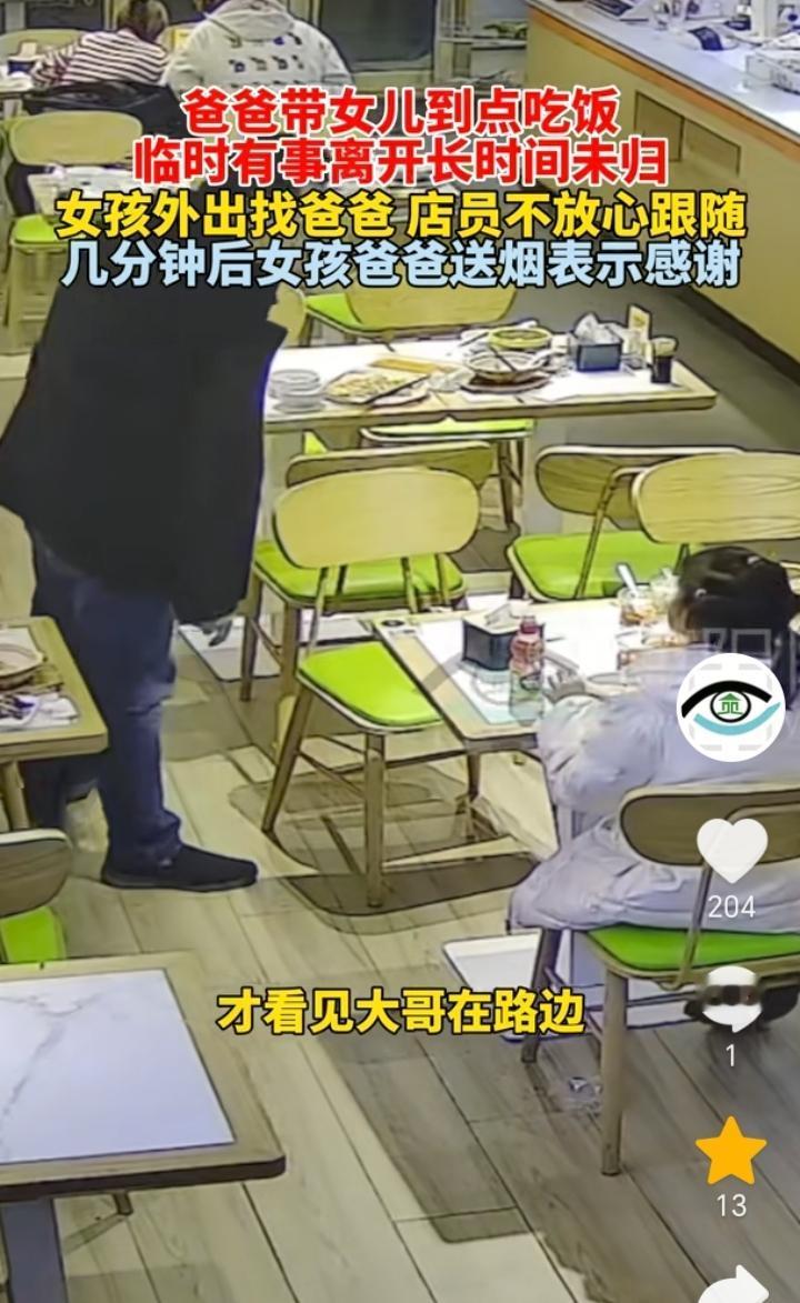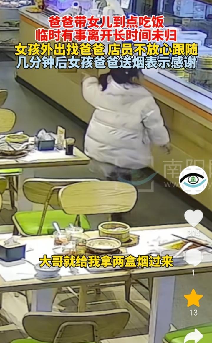 双向的奔赴!辽宁沈阳,爸爸带着女儿去饭店吃饭,吃了没一会爸爸就来回走了好几趟,最后一趟出去半天也没见回去,小女孩吃完饭可能也是等着急了,于是她就要出去找爸爸,店员不放心就陪着小女孩一块出去找,结果找了好几台车才发现小女孩爸爸在路边,店员把小女孩交给她爸爸后说了下就回到了店里,没想到的是过了几分钟后女孩爸爸就拿着两盒烟送给了店员,店员想退还女孩爸爸也没有要。 来回走几趟才出去可以看出女孩爸爸确实是有重要的事要处理,女孩等着急要出去找爸爸,店员肯定也是担心小女孩安全所以才跟着小女孩一块,虽然对于店员来说这是一件小事,但是从这里也可以看出店员的善良,小女孩爸爸送烟也是店员善良的回报,这份双向的奔赴让原本寒冷的天气有了温暖。 帮助她人不仅是中华的传统美德,同样也是一种考验人性的方式,我相信好人始终都会有好报。